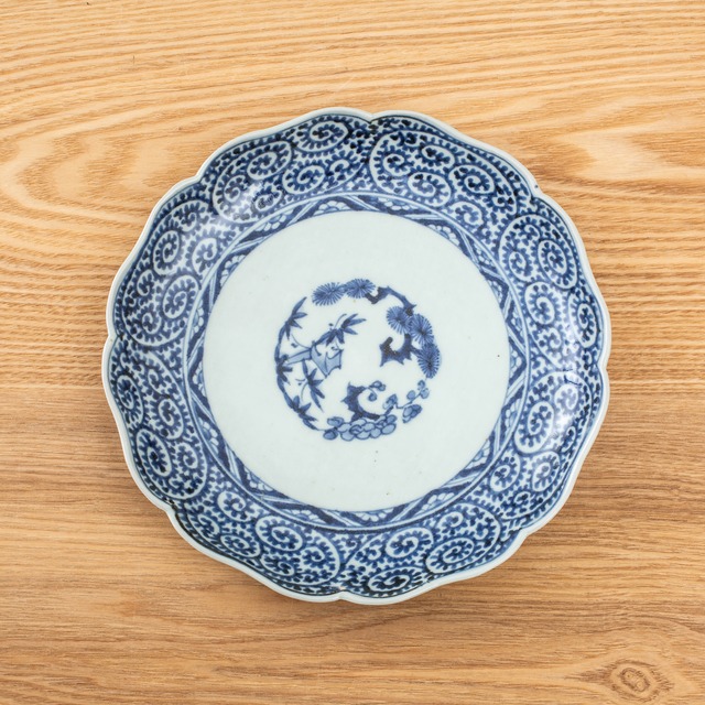 古伊万里 染付 蛸唐草 輪花 七寸皿 7寸 約21センチ プレート 平皿 大皿 見込み松竹梅 大明成化年製銘 吉祥文様 江戸時代 江戸後期 日本古陶磁 暮らしの骨董 生活骨董 用の美 アンティーク コレクション 和骨董 伊万里 有田 和食器【BS21】