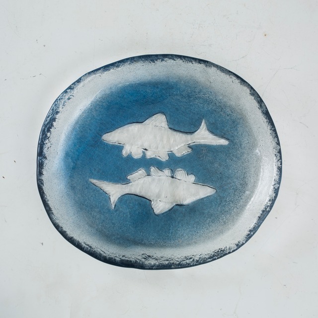 河上恭一郎 吹墨双魚文 楕円皿 ガラス皿 ガラス工芸 ガラス作家 栞 略歴付 共紙箱 涼しげ 和食器 だ円 変形皿 吉祥文様 【BA389】