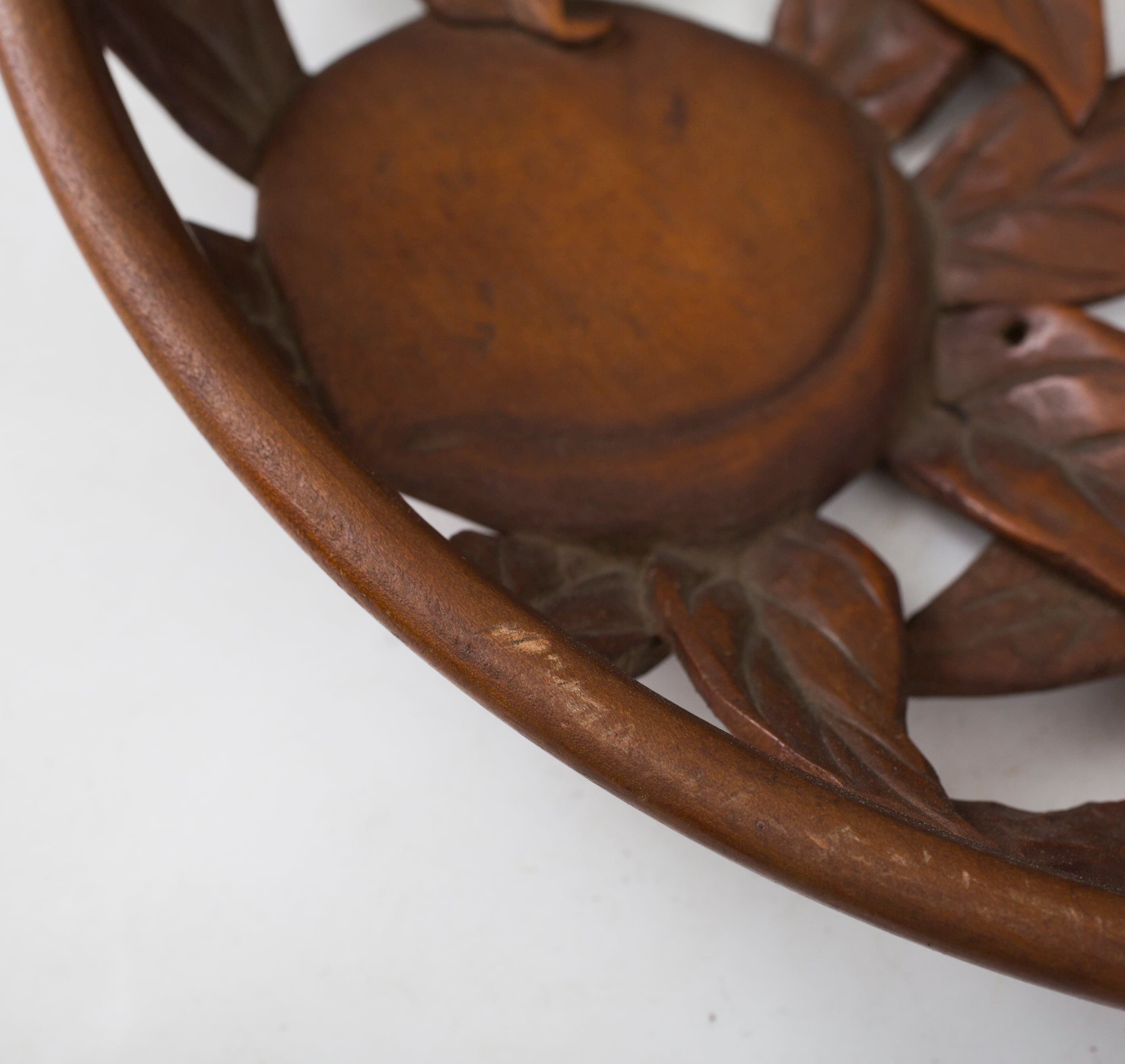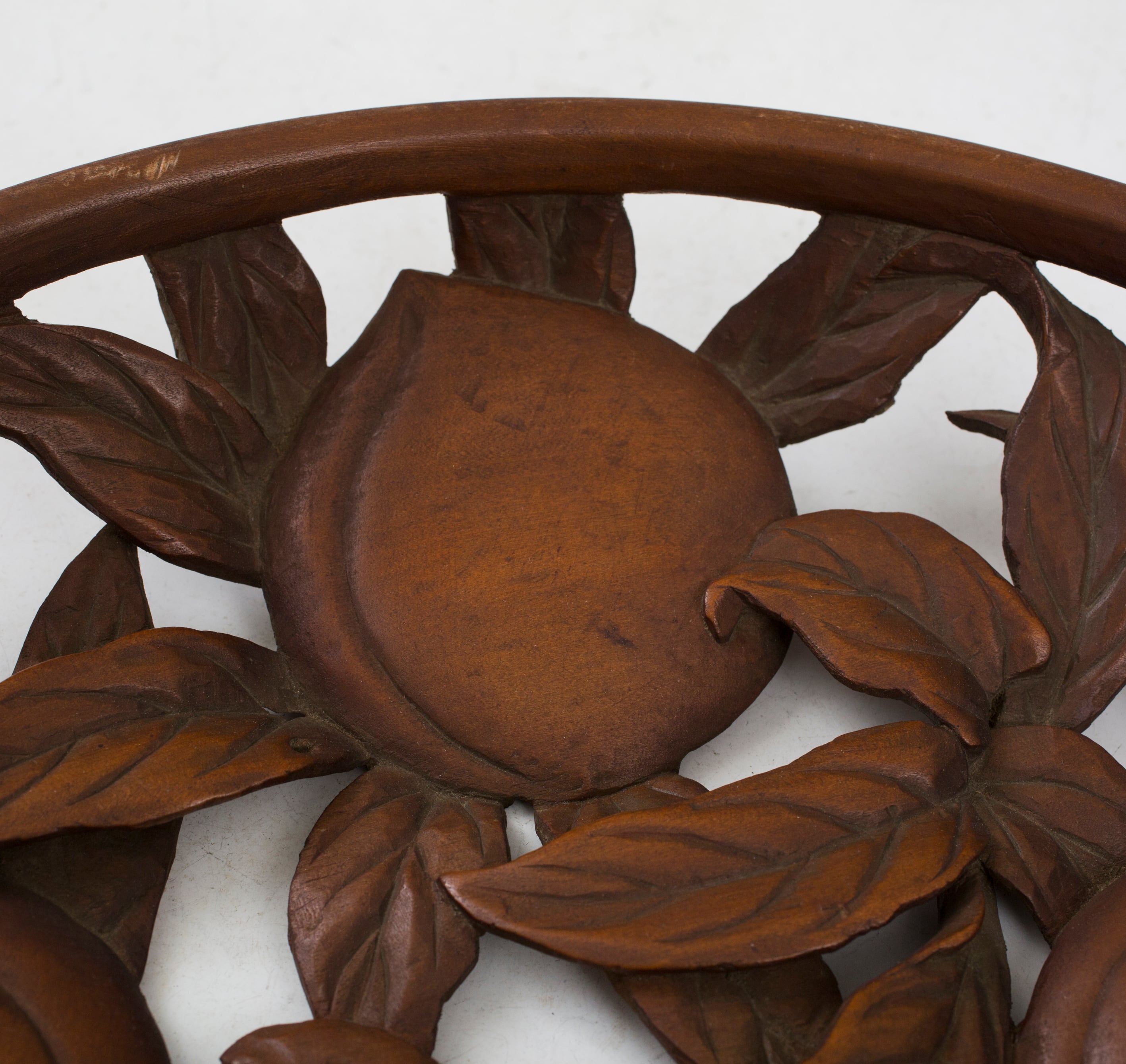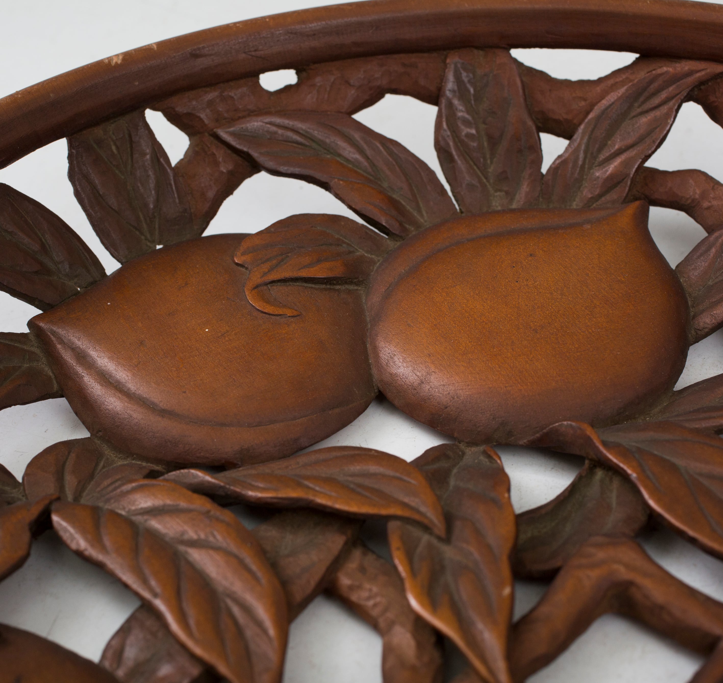 【スタッフから一言】表、裏ともに立体感ある木彫です。桃は古来より吉祥文様として用いられてきました。季節だけでなくハレのインテリアとしておすすめです。縁の部分などに経年使用によるコスレキズあり。