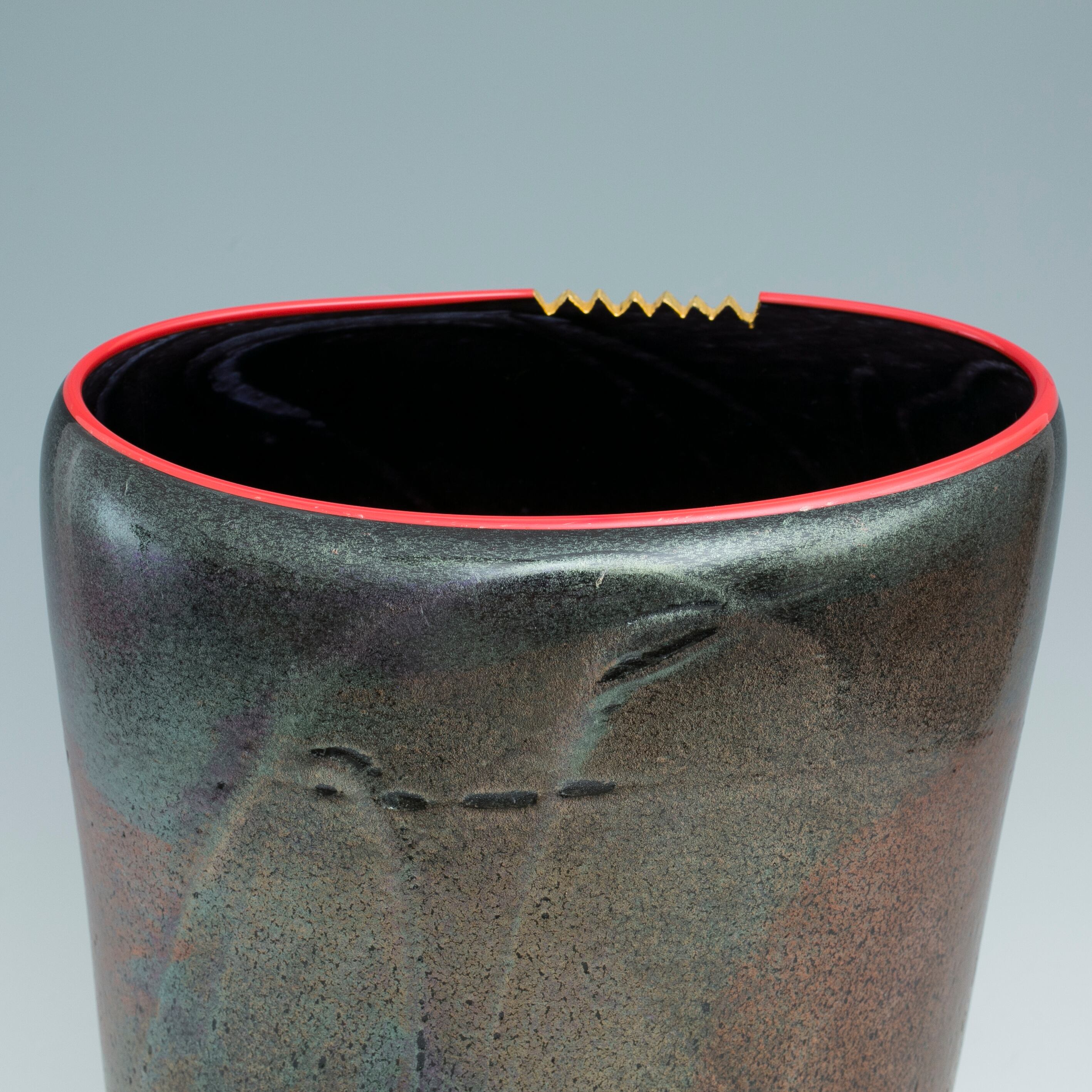 迫二郎 石彩花器 花瓶 花入 フラワーベース インテリア オブジェ 置物 共箱 ガラス 現代ガラス ガラス作家 日本美術 ガラス工芸 チタン 窯変 モダンデザイン【BB147】