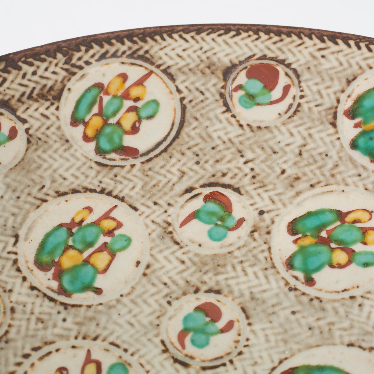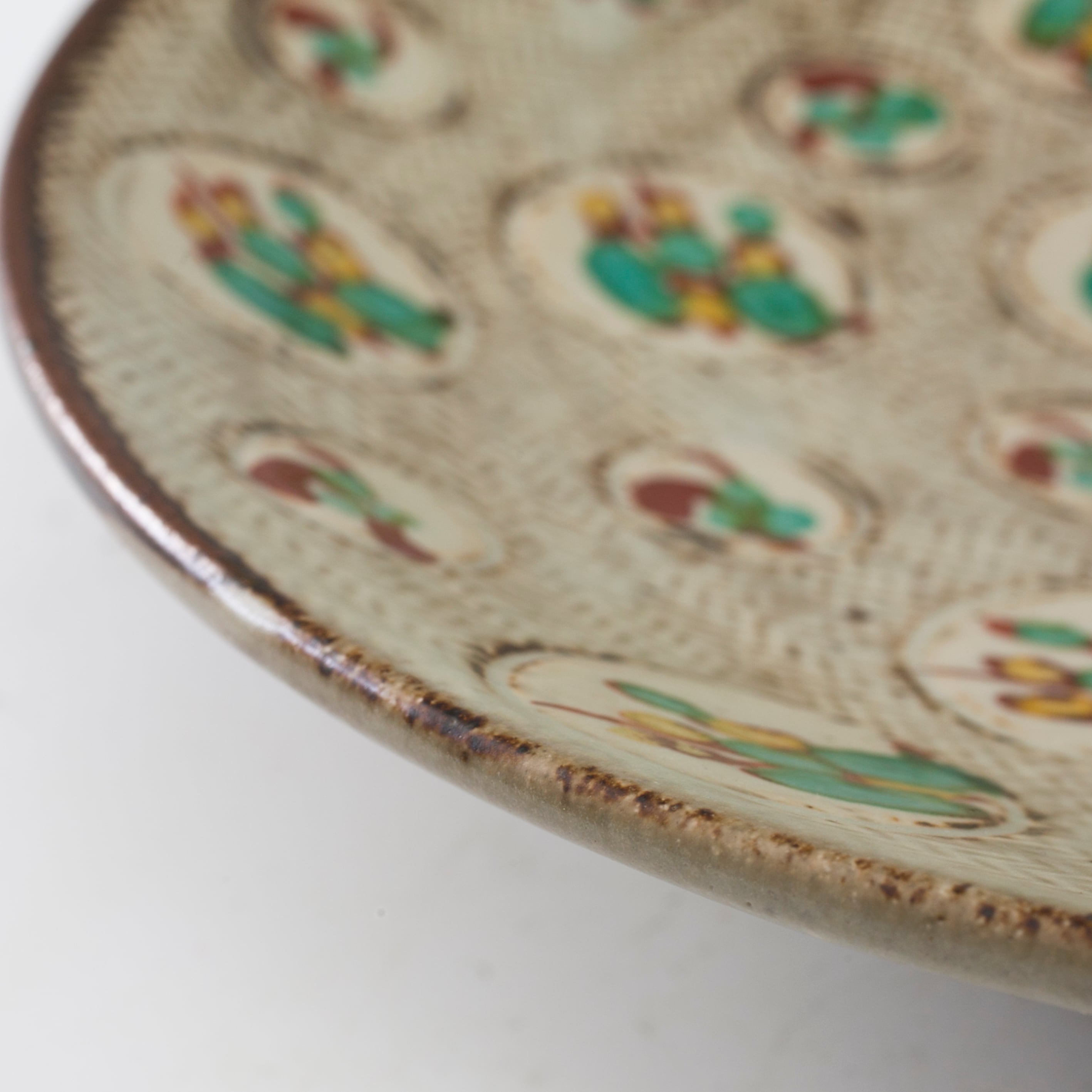象嵌赤絵草花文 皿 大皿 島岡達三 共箱 縄文象嵌 人間国宝 益子焼 民藝 陶器 陶芸家 重要無形文化財保持者 用の美 民芸 日本陶磁 27センチプレート 略歴の栞付【BC204】