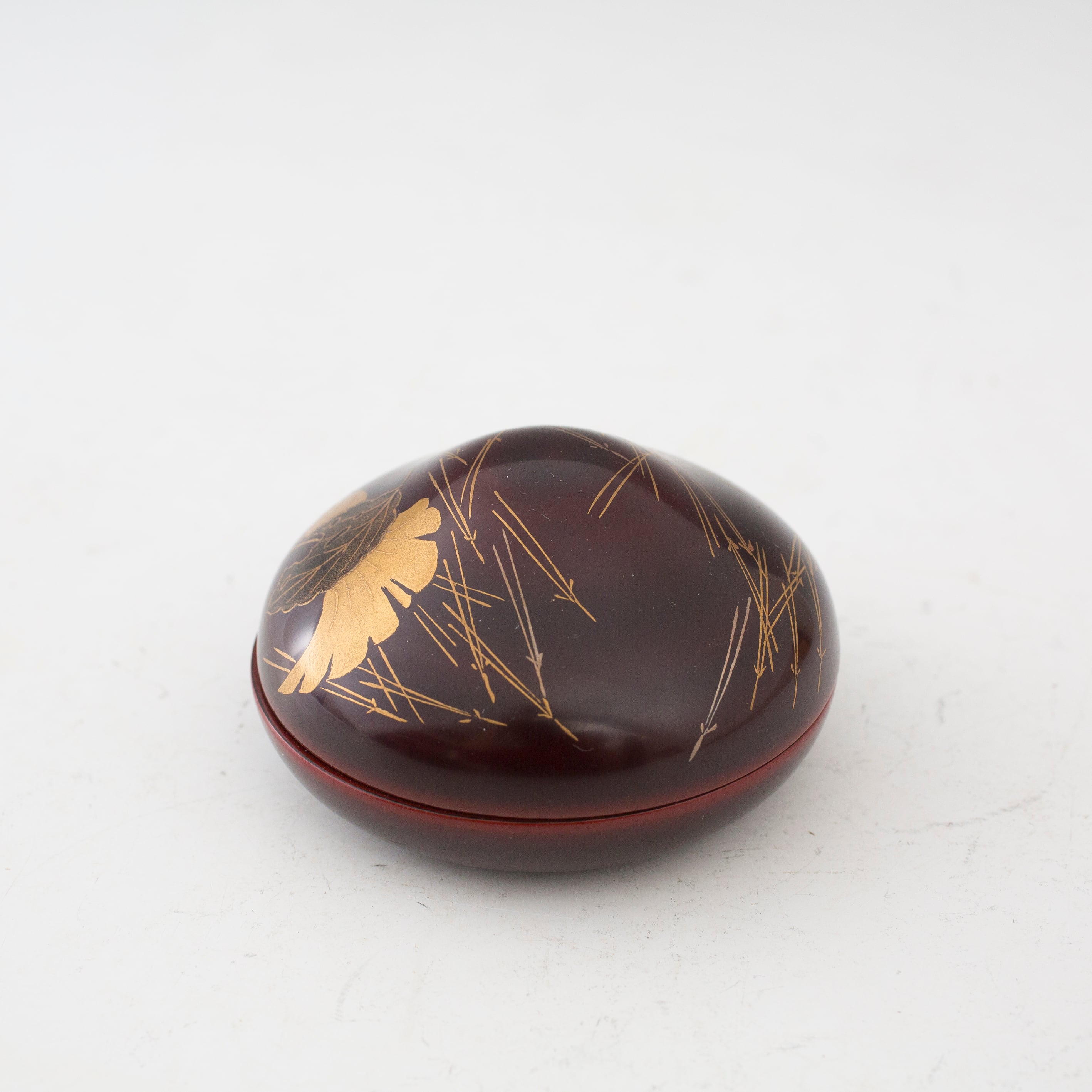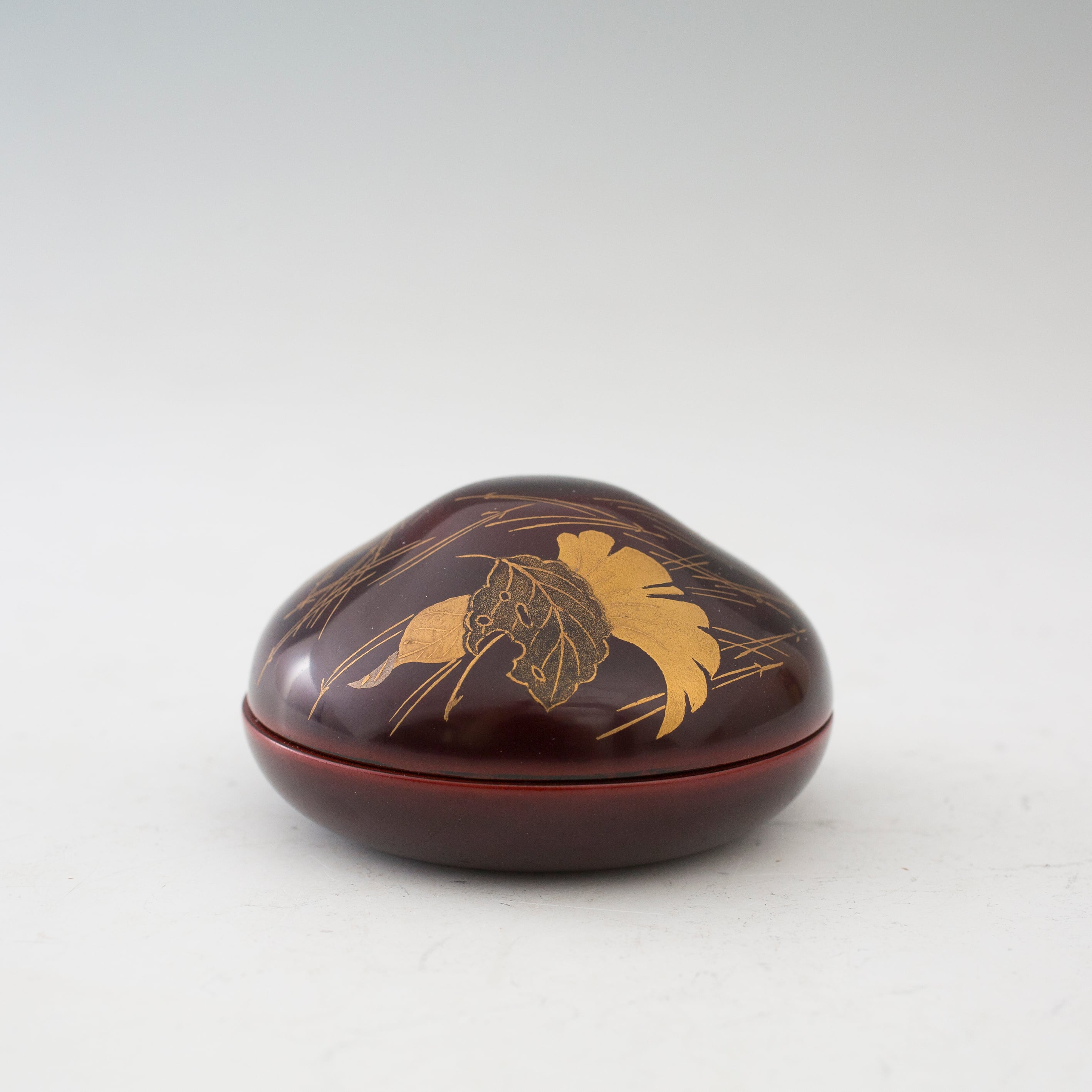 吹寄蒔絵は、紅葉、銀杏、松葉などの図案を組み合わせ、落ち葉や草花が風で吹き寄せられた様子を表現したもの。雰囲気の良い香合です。