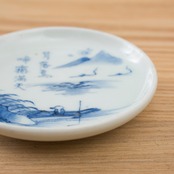 唐の詩人・張継が詠んだ漢詩『楓橋夜泊』の冒頭、「月落烏啼霜満天」。日本でもよく知られる漢詩の情景を小さな豆皿に描いています。豆皿の漢詩部分一行目の区切が2パターンあります。書き手による違いもまた一興。