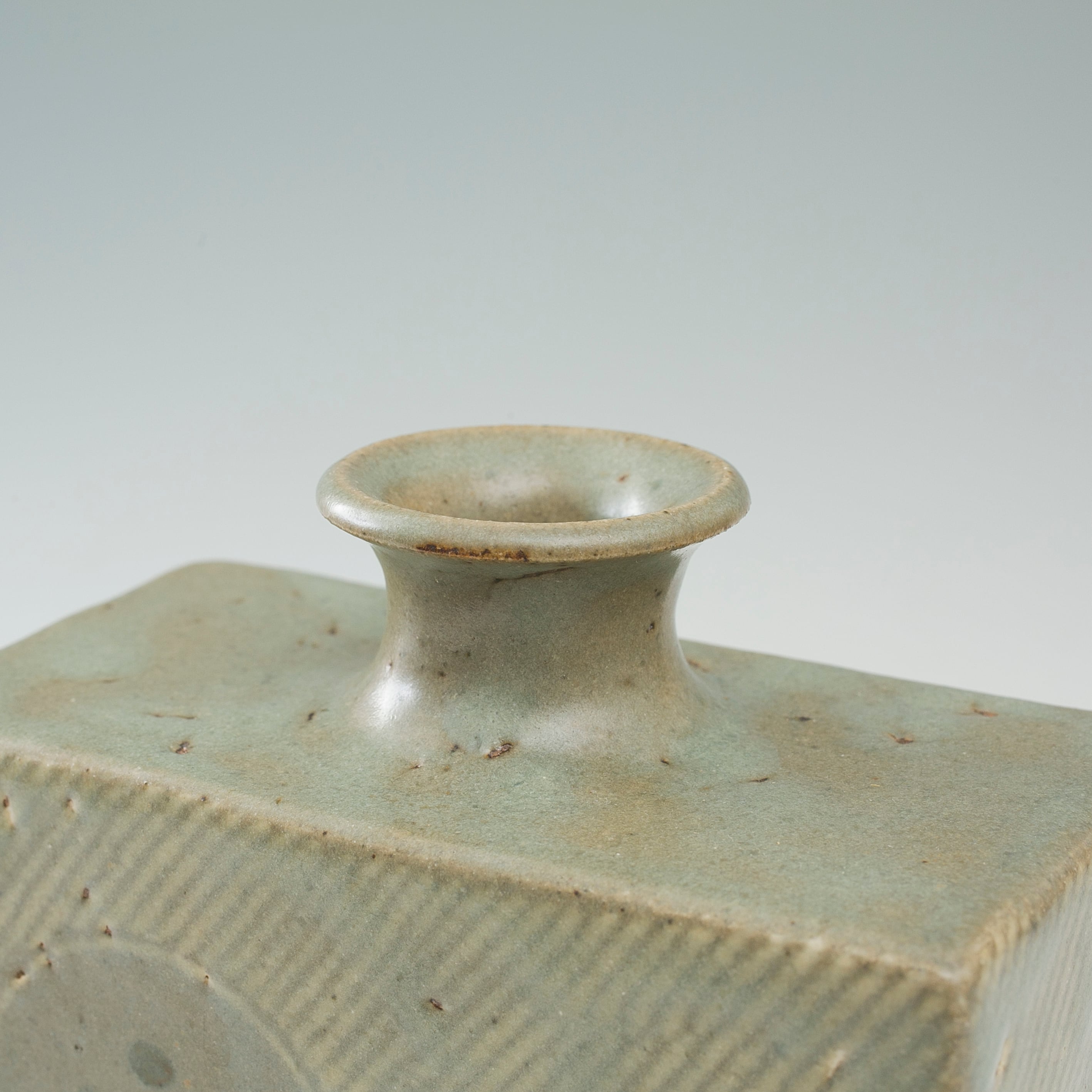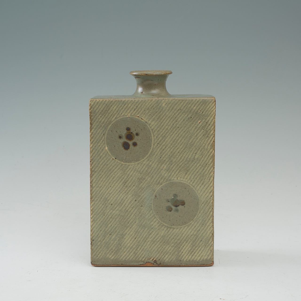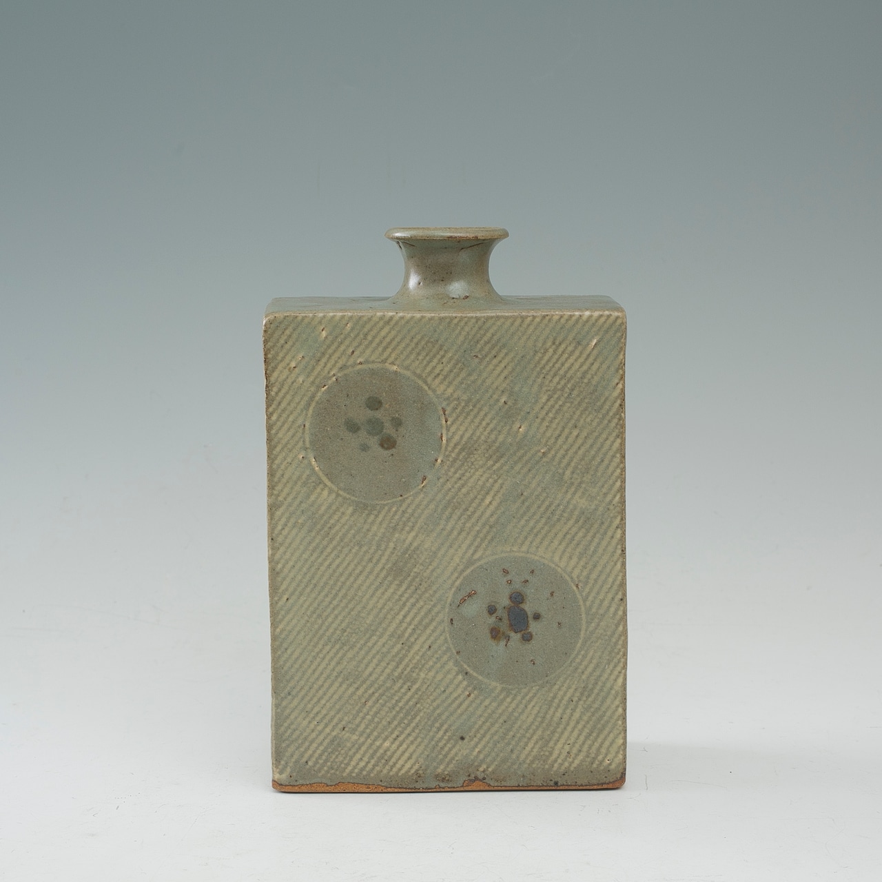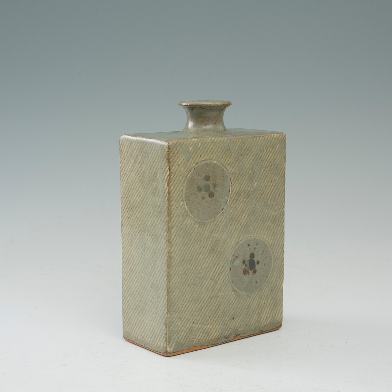 島岡達三 扁壷 花瓶 象嵌 縄文象嵌 花器 花入 オブジェ 置物 インテリア 共箱 作家物 人間国宝 益子焼 民藝 陶器 陶芸家 重要無形文化財保持者 用の美 可愛い名品 日本陶磁 師は浜田庄司 【BA386】