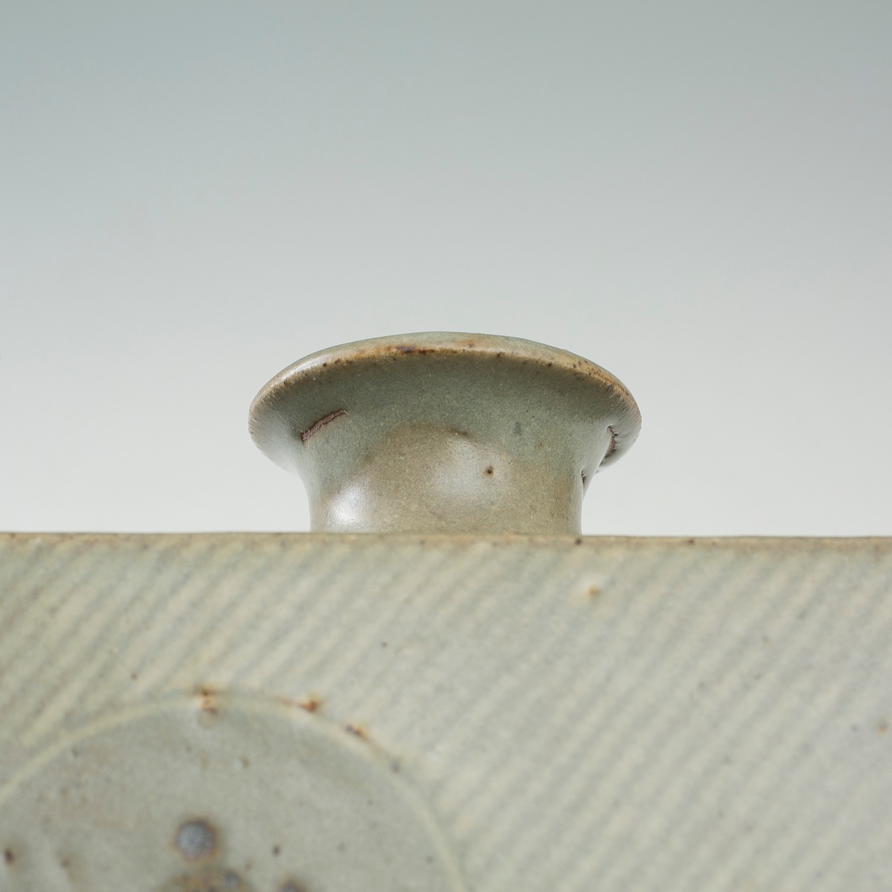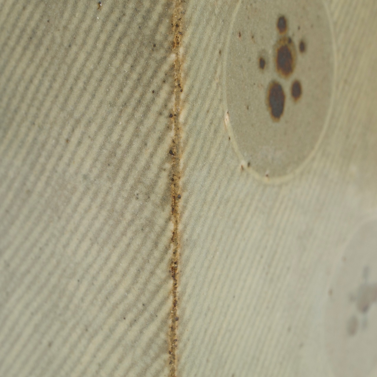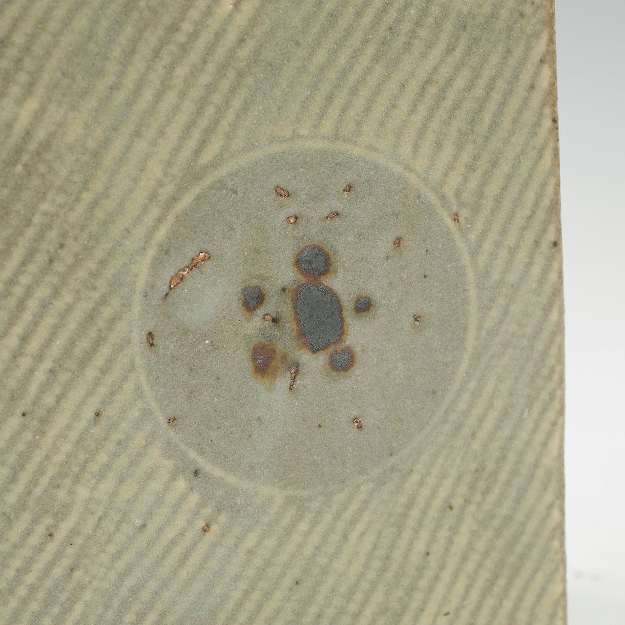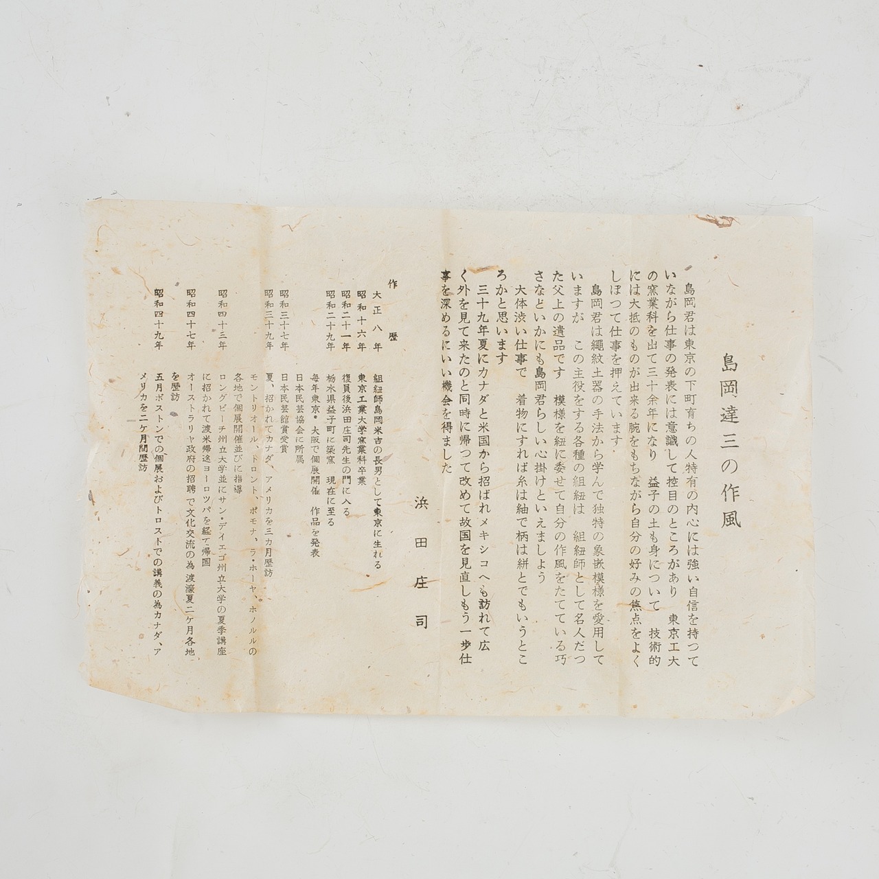 【スタッフから一言】島岡の作風の代名詞ともいえる縄文象嵌模様。それに用いられる組紐は組紐師だった島岡の父の遺品であると浜田庄司によって記されています。