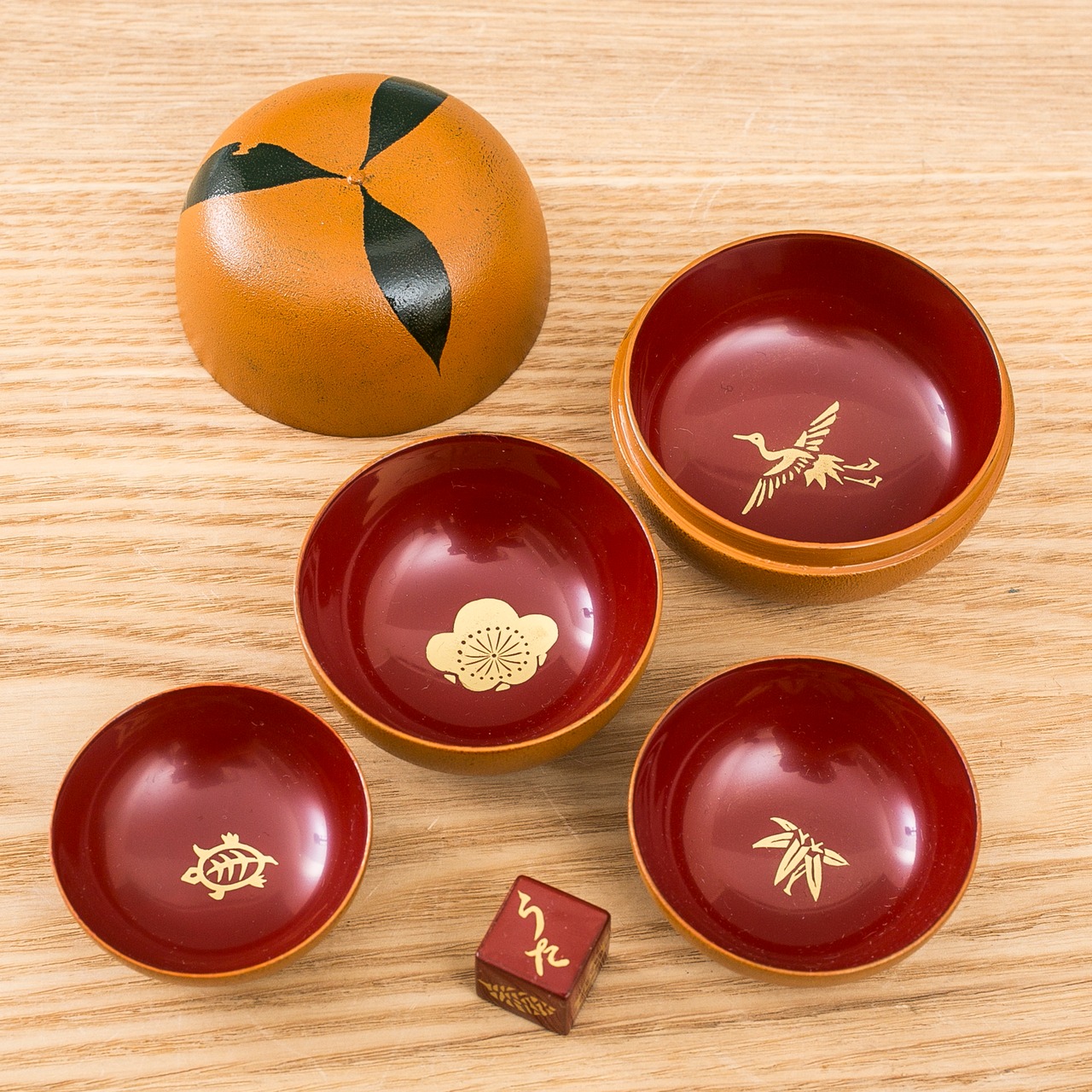山田平安堂 橙 座興盃 乾漆 蒔絵 内朱 鶴亀 松竹梅 入れ子酒器 重ね盃 酒器 猪口 ぐい呑み 盃 日本酒に サイコロ付 だいだい 柑橘 果物 呉藤友乗復刻【BB188】 | 3hige antique store | 京都・古門前の古美術店 | 三髭堂