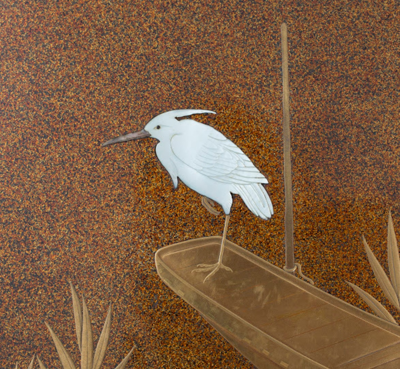 【スタッフから一言】鷺が蝶貝、月が金属(銀)で表現されています。梨子地で華やかな硯箱です。コキズなどもありますが全体としてコンディションは良く、コレクションとしてもおすすめ。