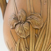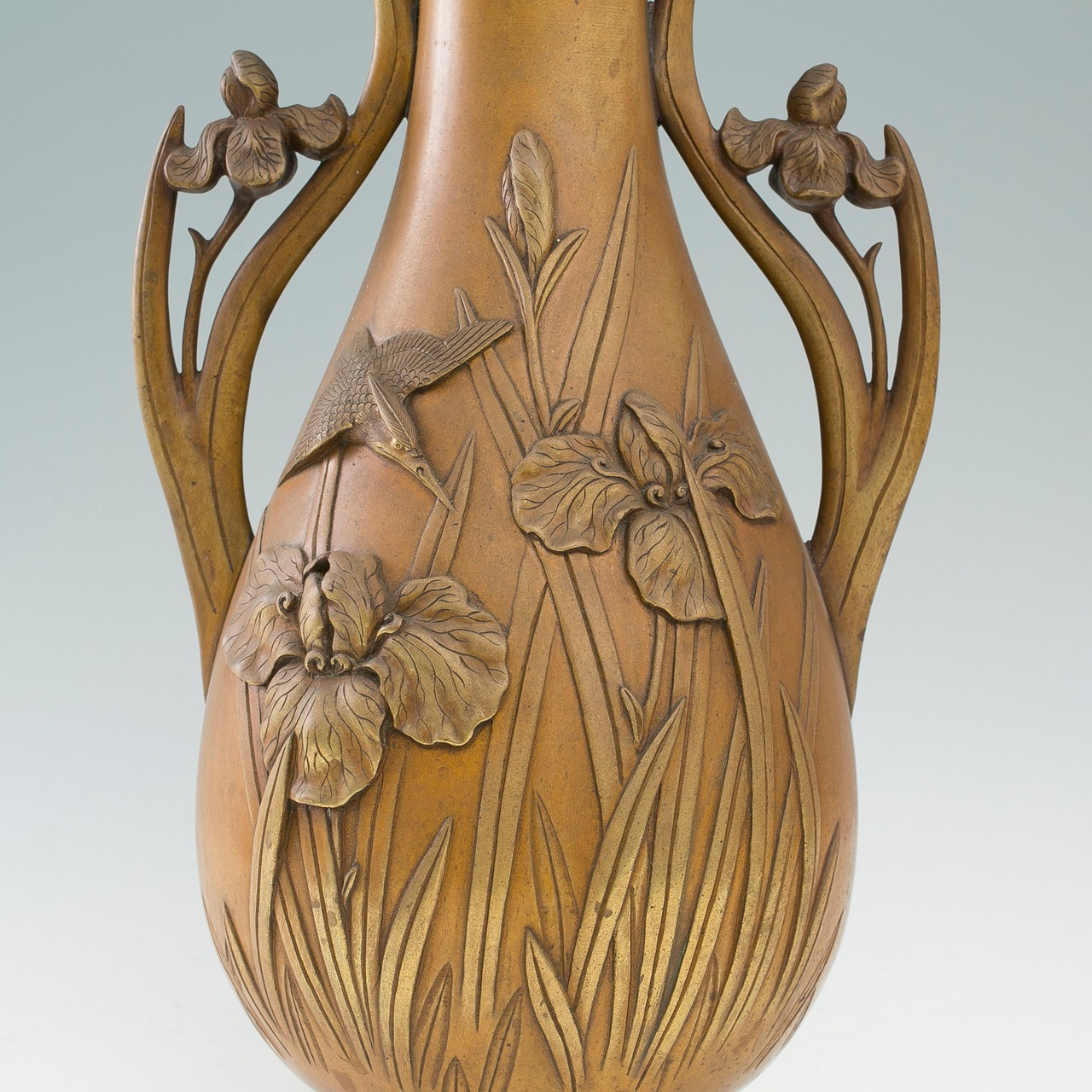 菖蒲 アヤメ カキツバタ 杜若 燕子花 銅製 花瓶 棚村銘 高盛上 高肉 耳付 双耳 金工 伝統工芸 花器 花生 フラワーベース オブジェ インテリア 置物 時代物 アール・ヌーヴォー アールヌーボー 明治金工 超絶技巧 アンティーク 和骨董 コレクション【BB191】