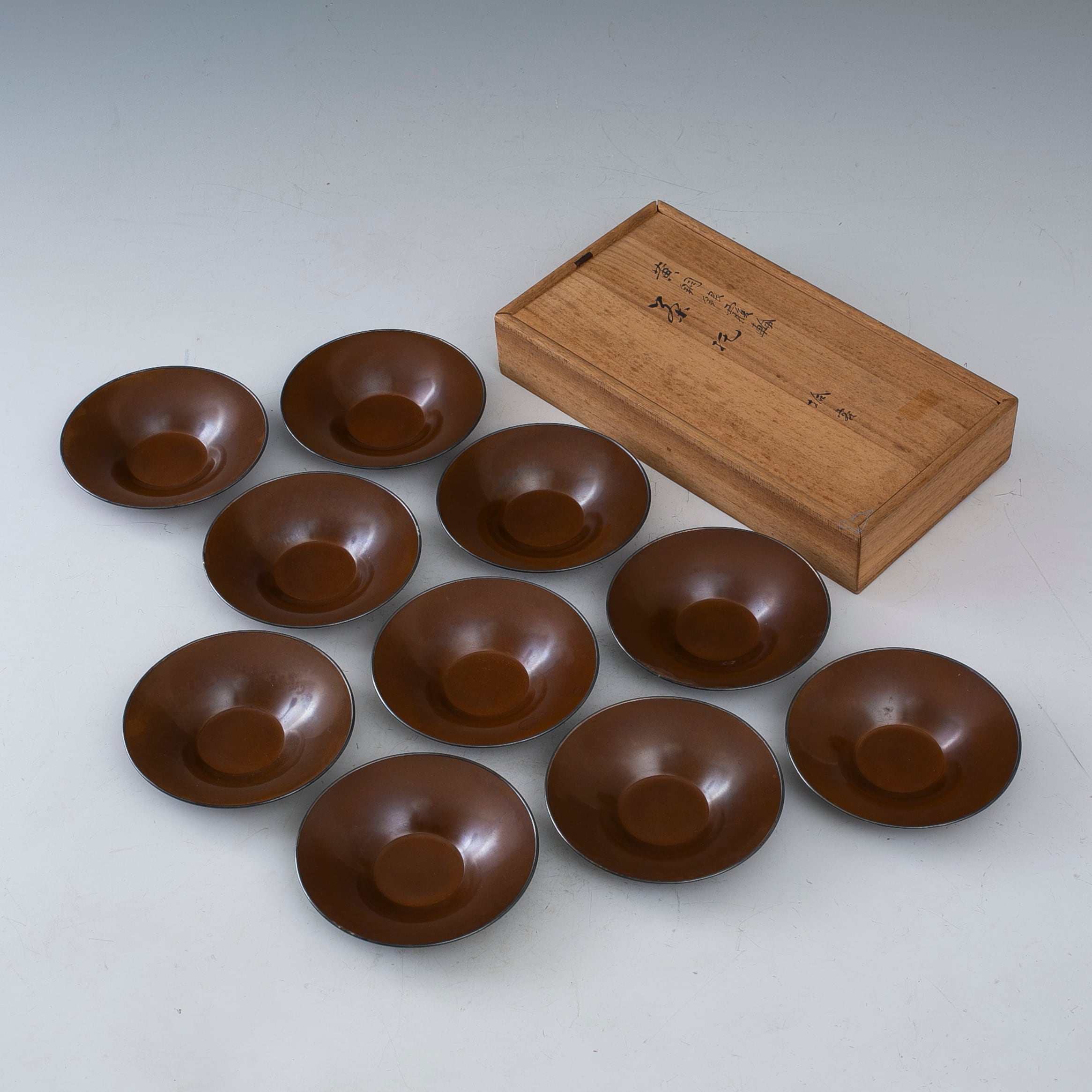 "三髭堂オンラインショップをご覧頂きまして誠にありがとうございます。こちらの商品は、黄銅 銀覆輪 茶托 丸形 円式 煎茶道具 茶道具 托子 金工 金属工芸 銀縁 金龍堂 松尾忠久 10客 10枚 揃い 共箱 和骨董 古玩 アンティーク【BB201】です。時代なりの汚れなどございますので画像にてご確認下さい。