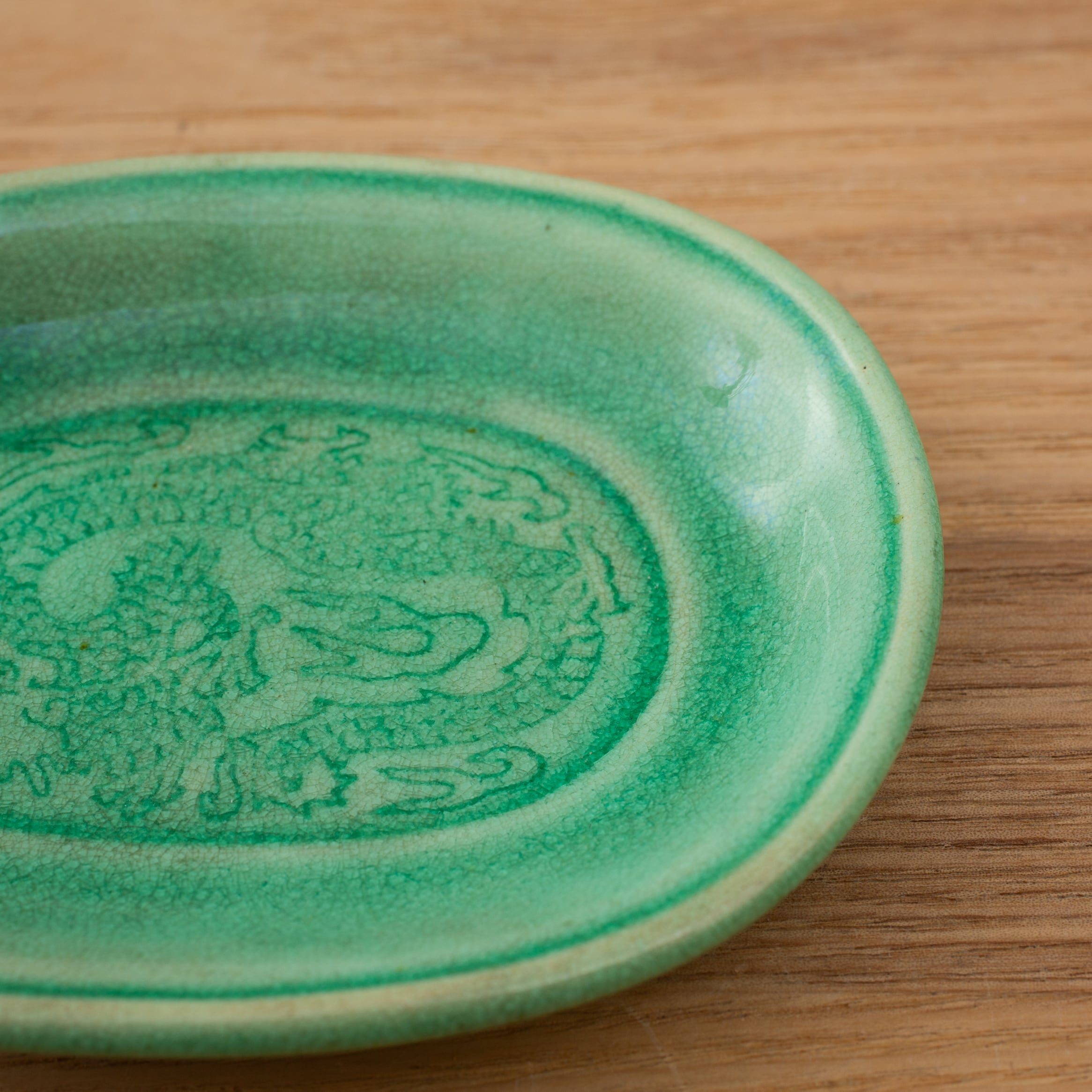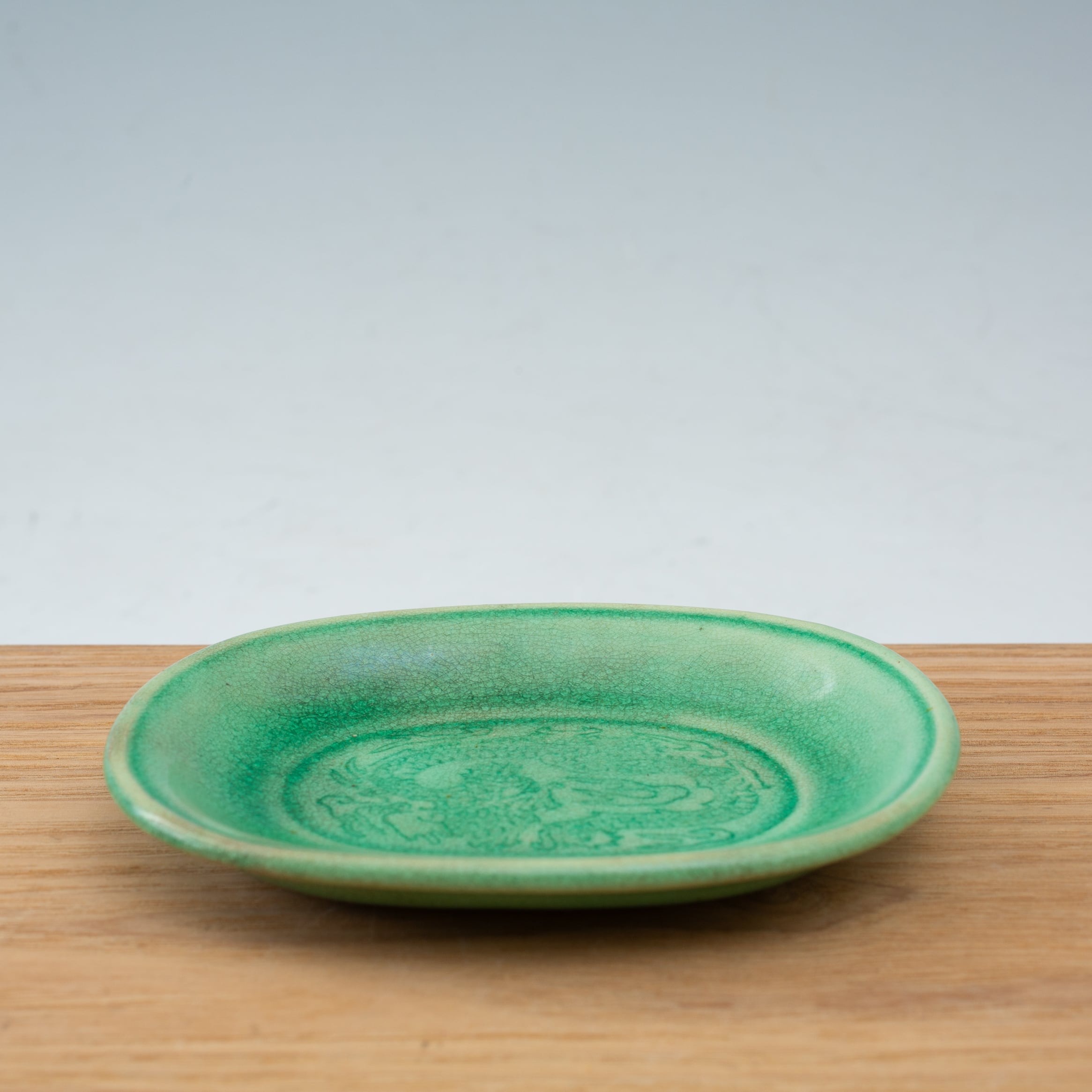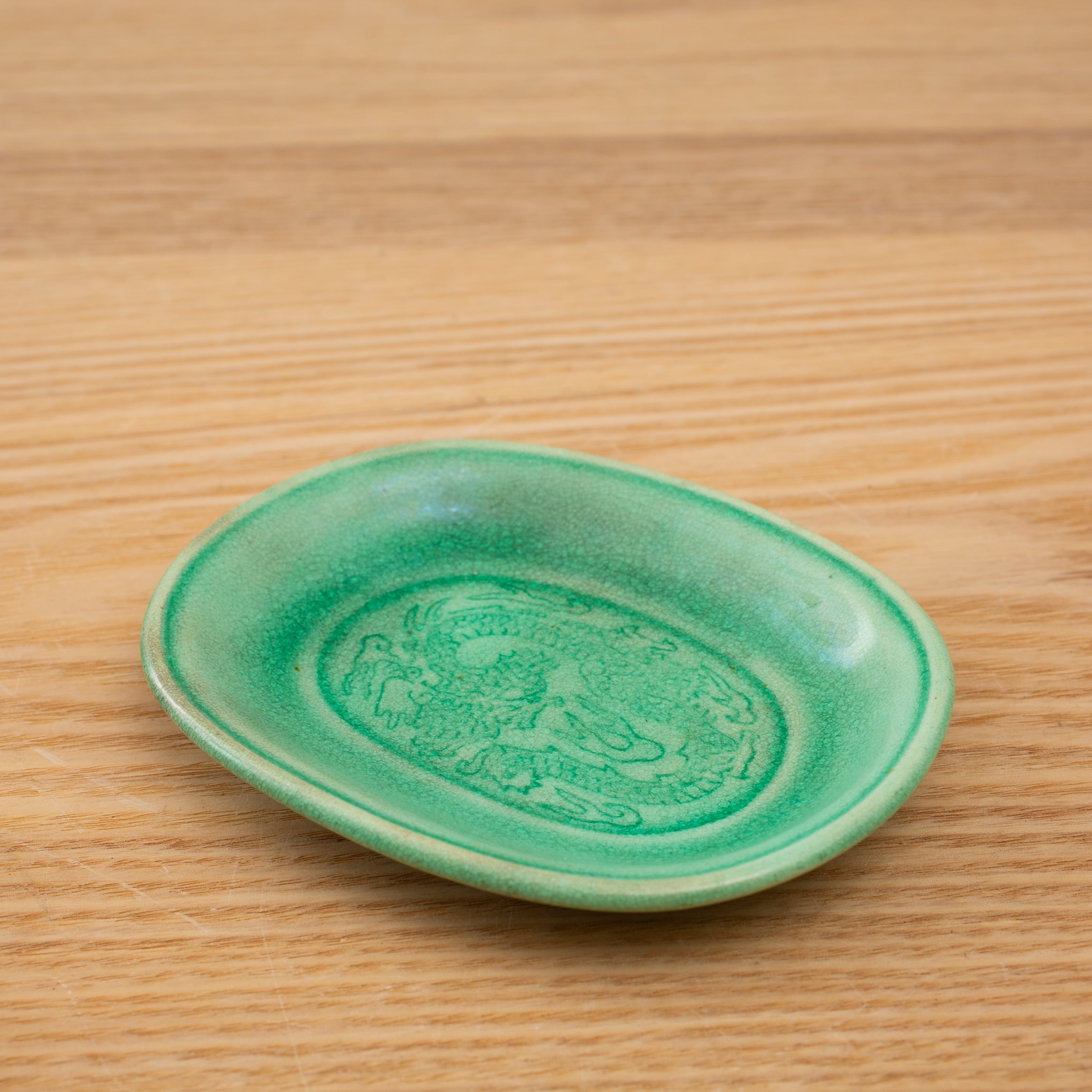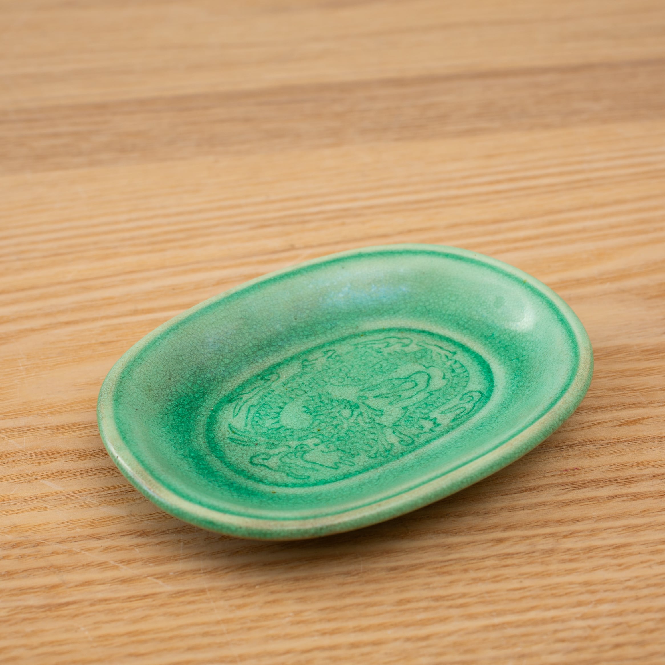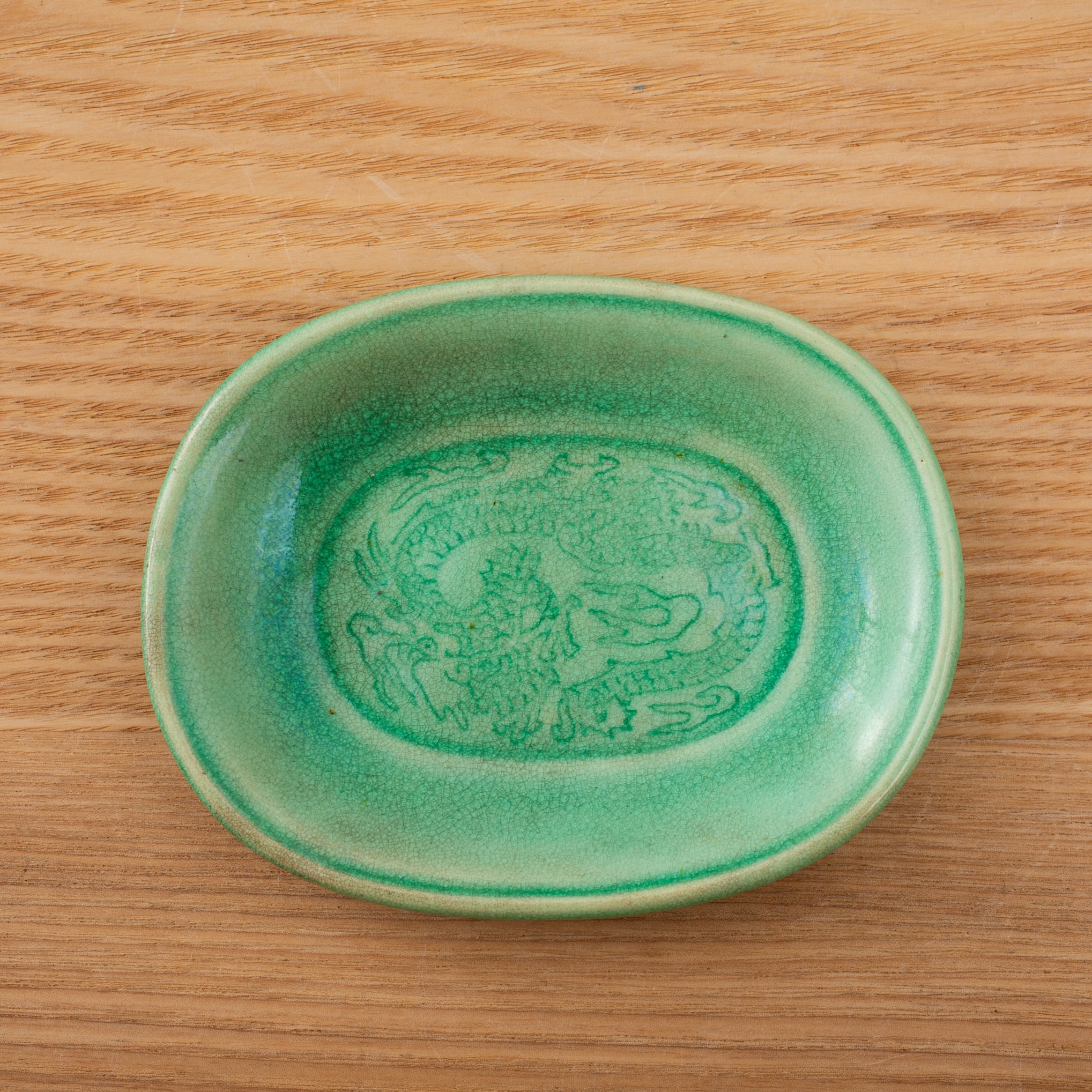 珉平焼 緑釉 薄いグリーン 小判形 龍文様 小皿 カラフル 料理屋さんの器 懐石の器 人気 日本陶磁 日本美術 兵庫県の焼物 淡路島の焼物 アンティーク レトロ テーブルコーディネート 淡路焼 用の美 生活骨董【BS18】