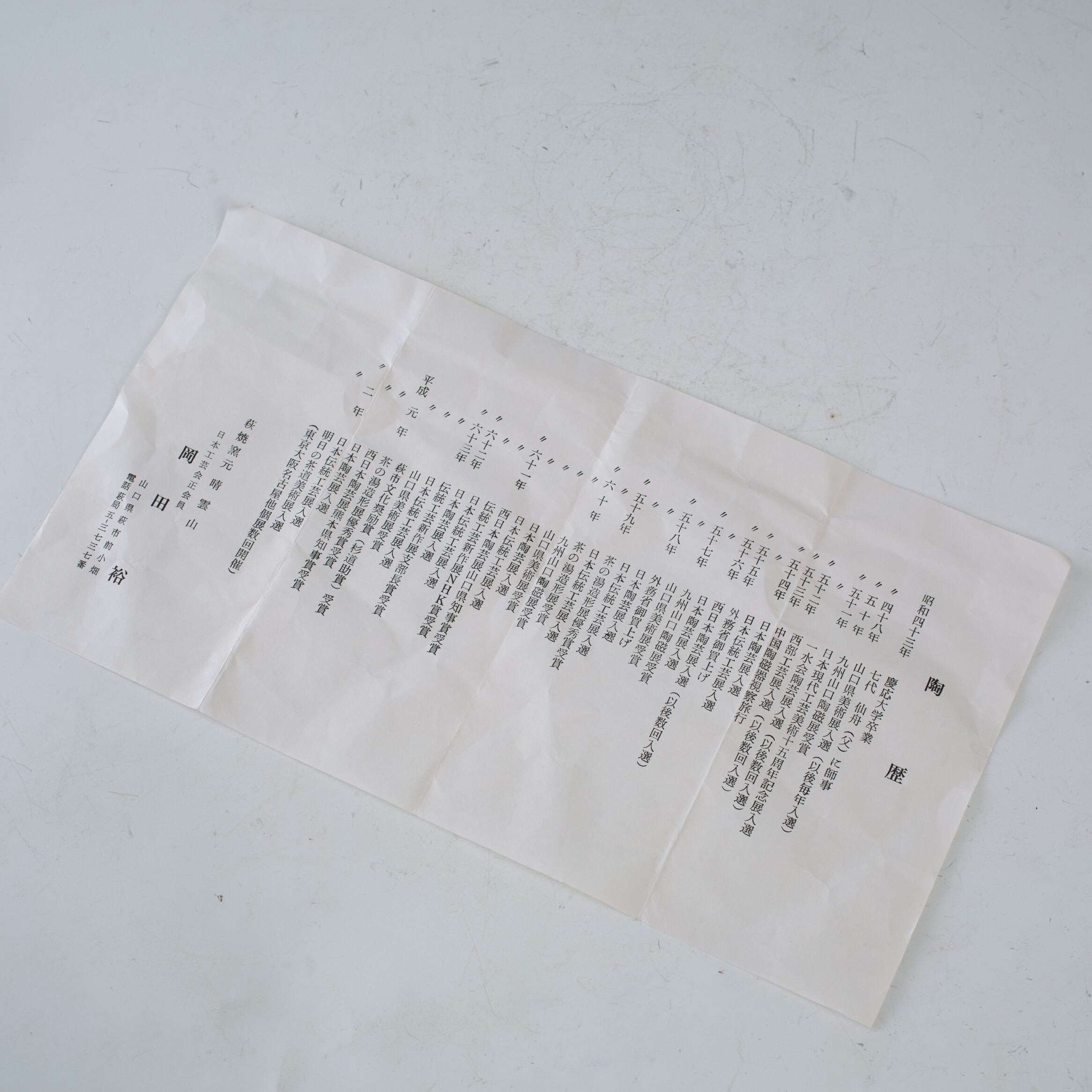 七代岡田仙舟の長男として生まれ、父・七代に師事しながら、日本伝統工芸展を中心に新作を発表。2004年には八代を継承した。山口県指定無形文化財萩焼保持者。略歴詳細(平成二年のところまで)の栞同封しています。