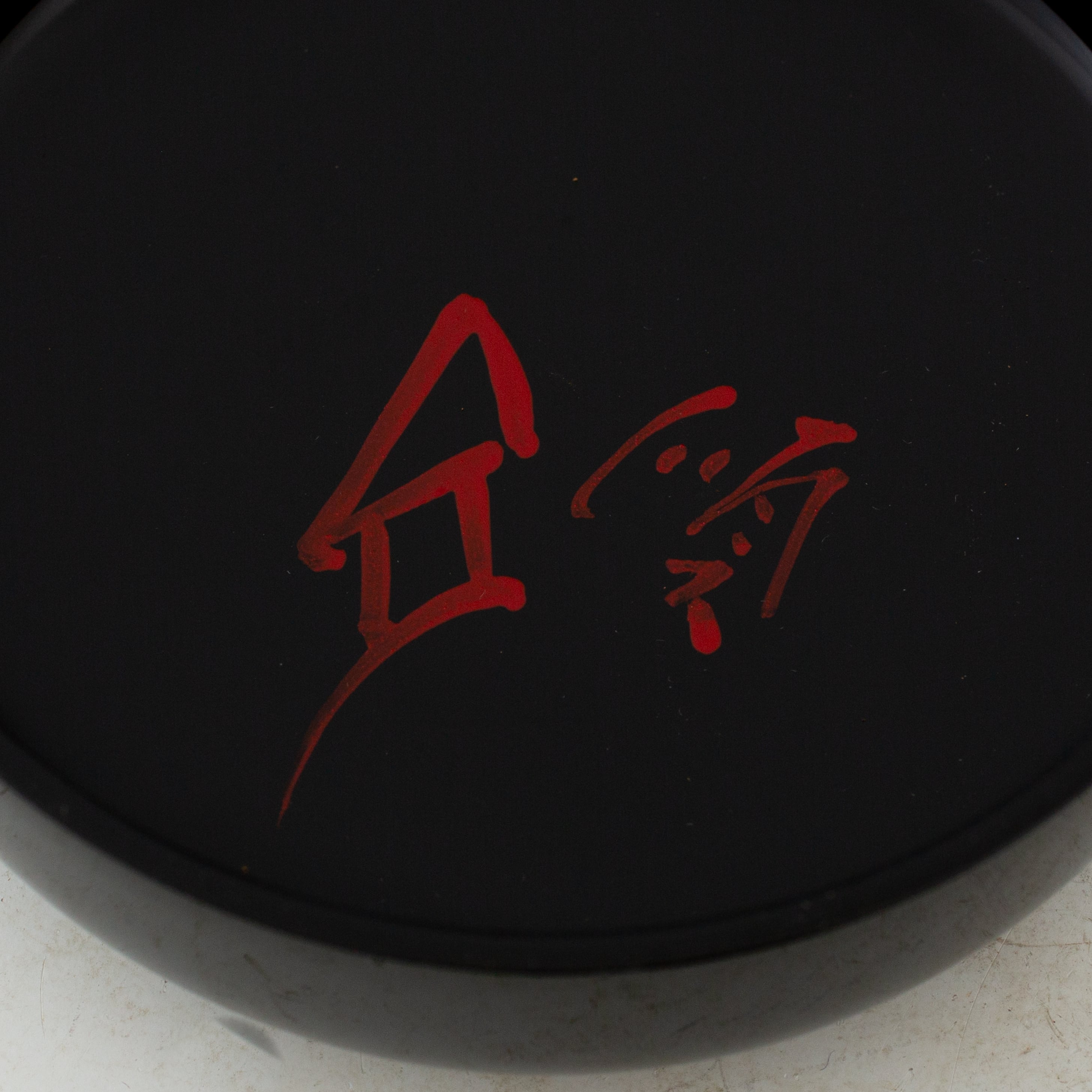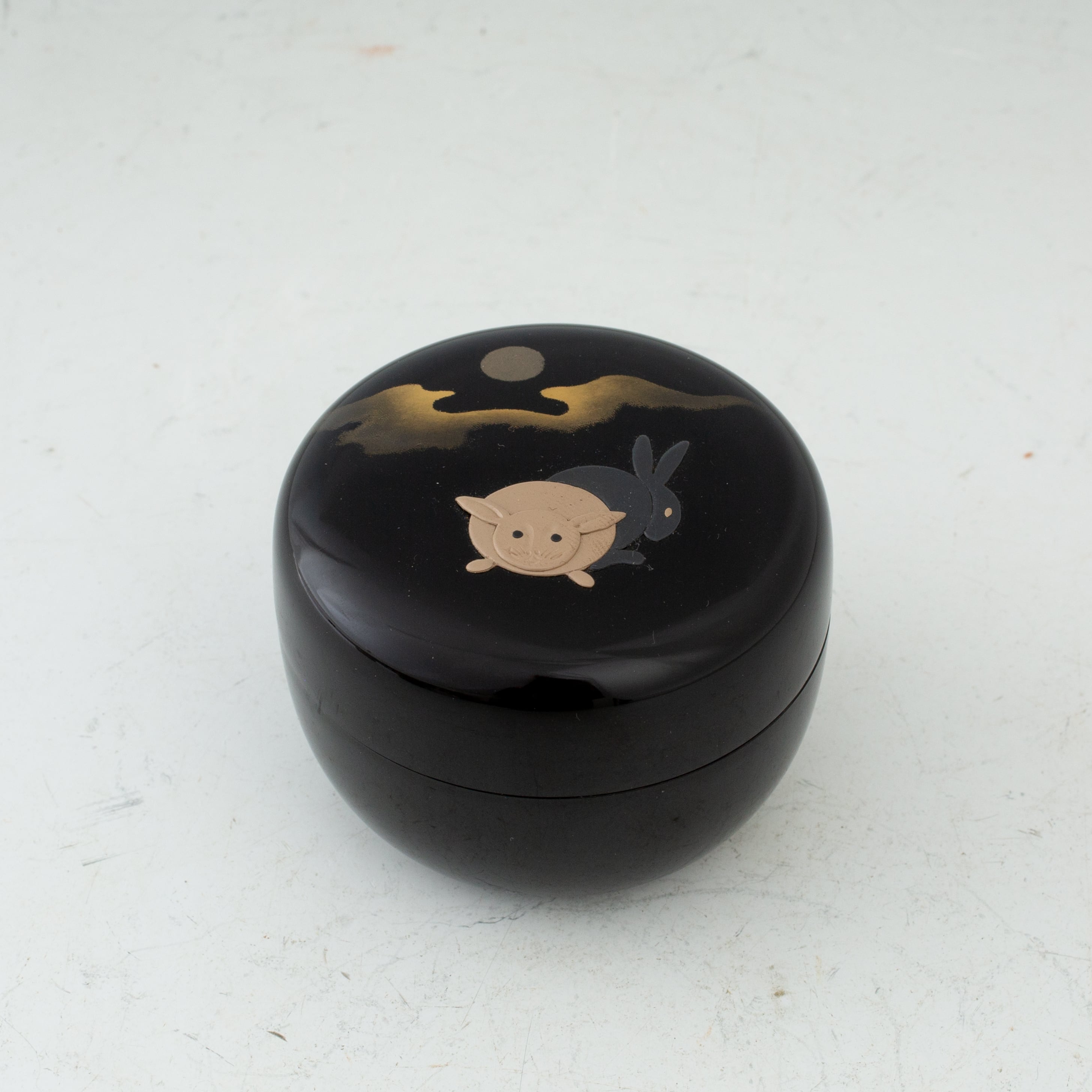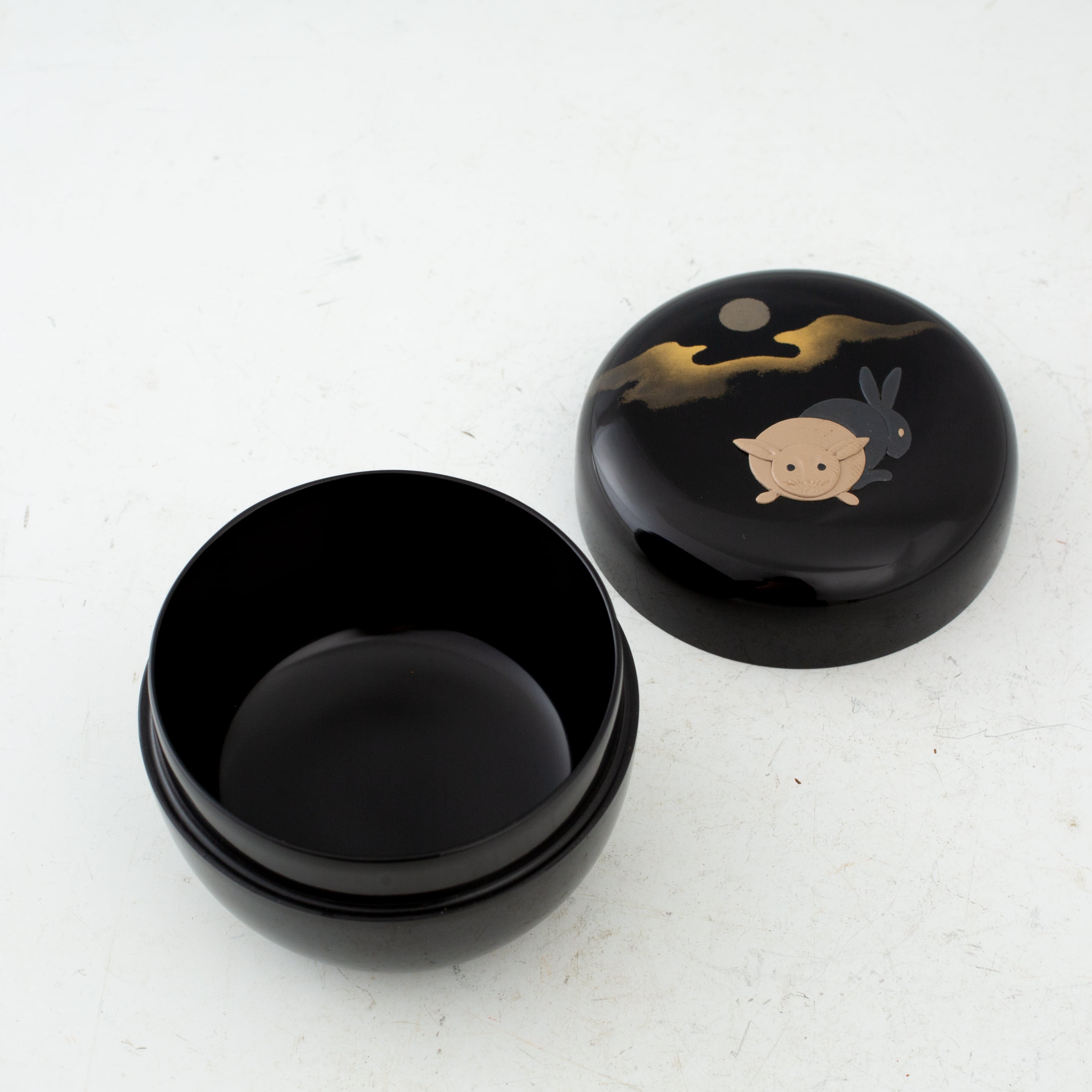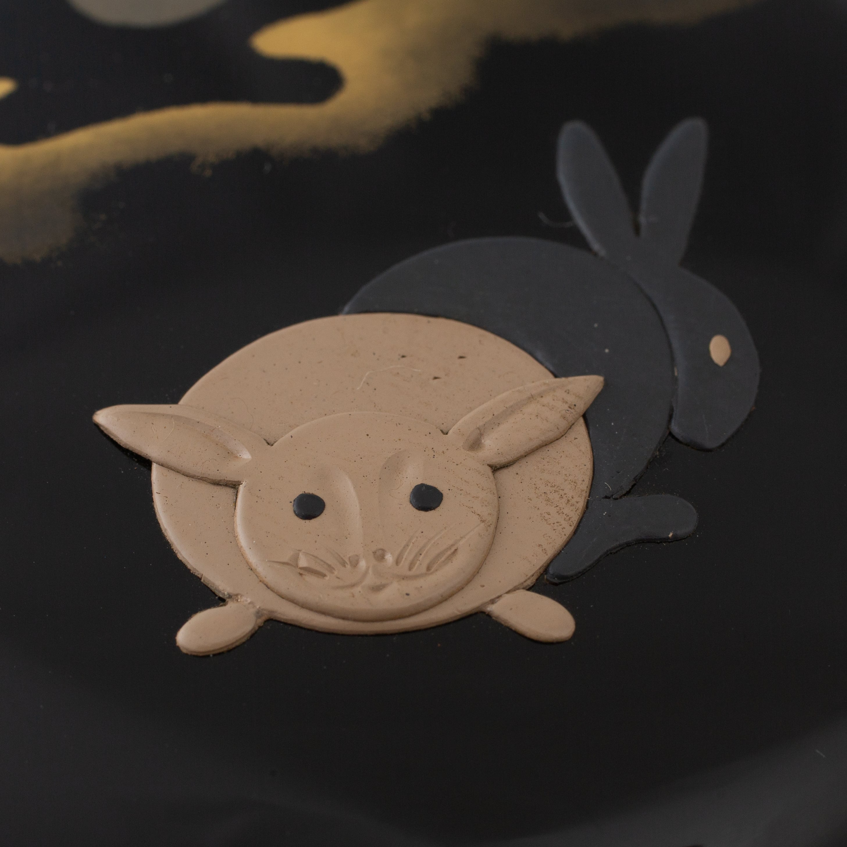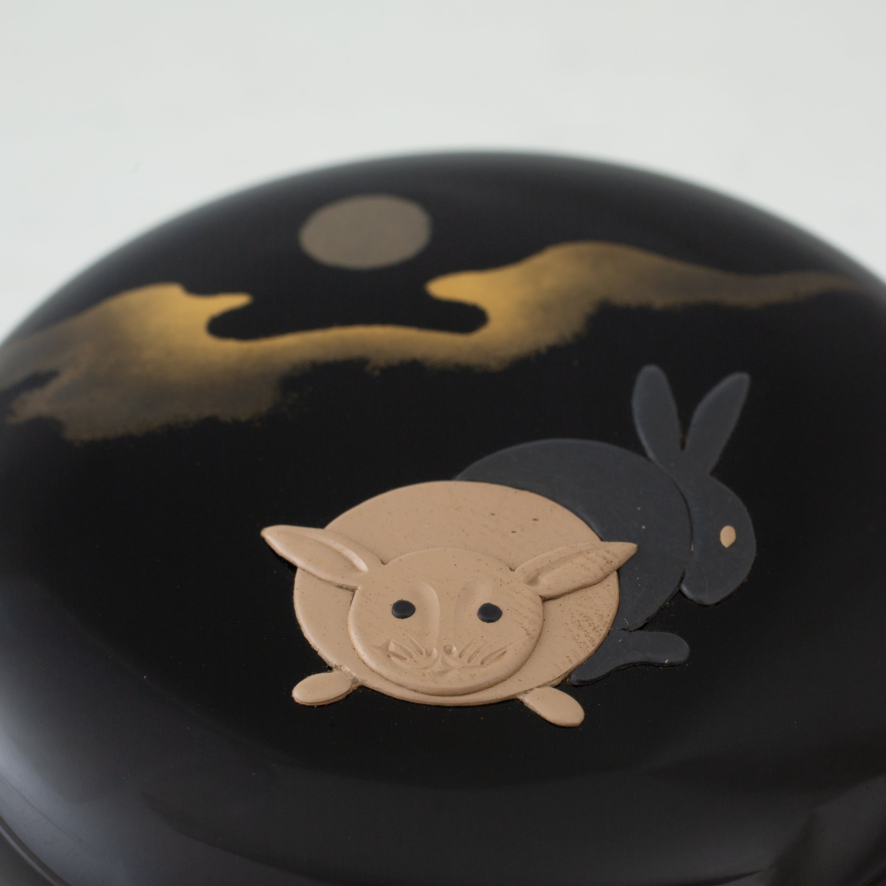 【スタッフから一言】うさぎは琉球漆芸の伝統技法である堆錦、月と雲は沖縄蒔絵で作られています。蓋内側に朱で宗順の花押あり。