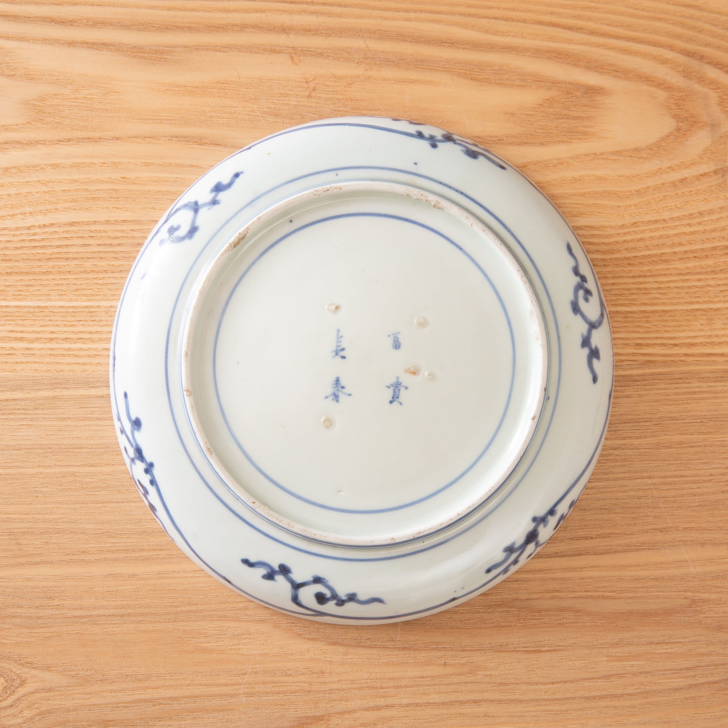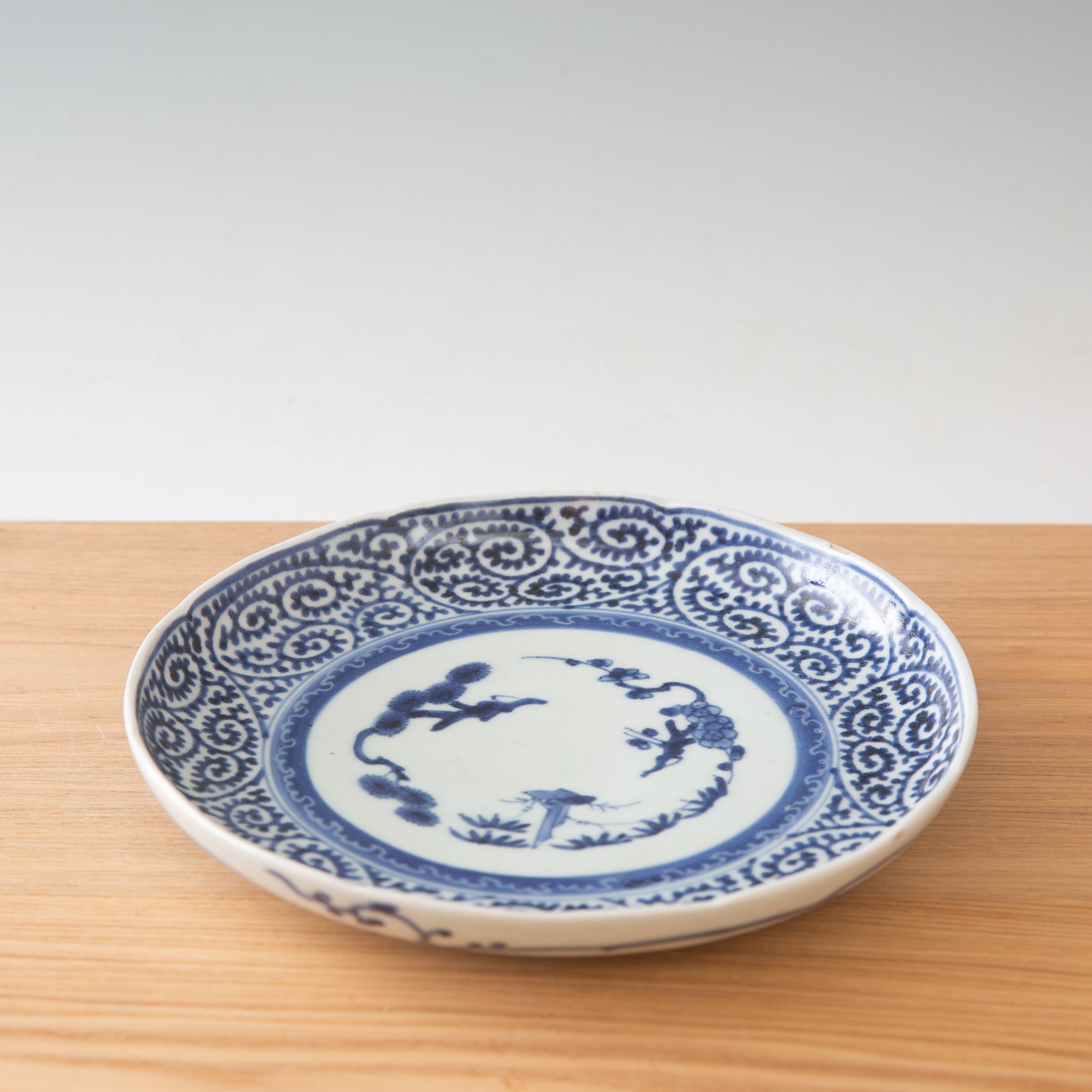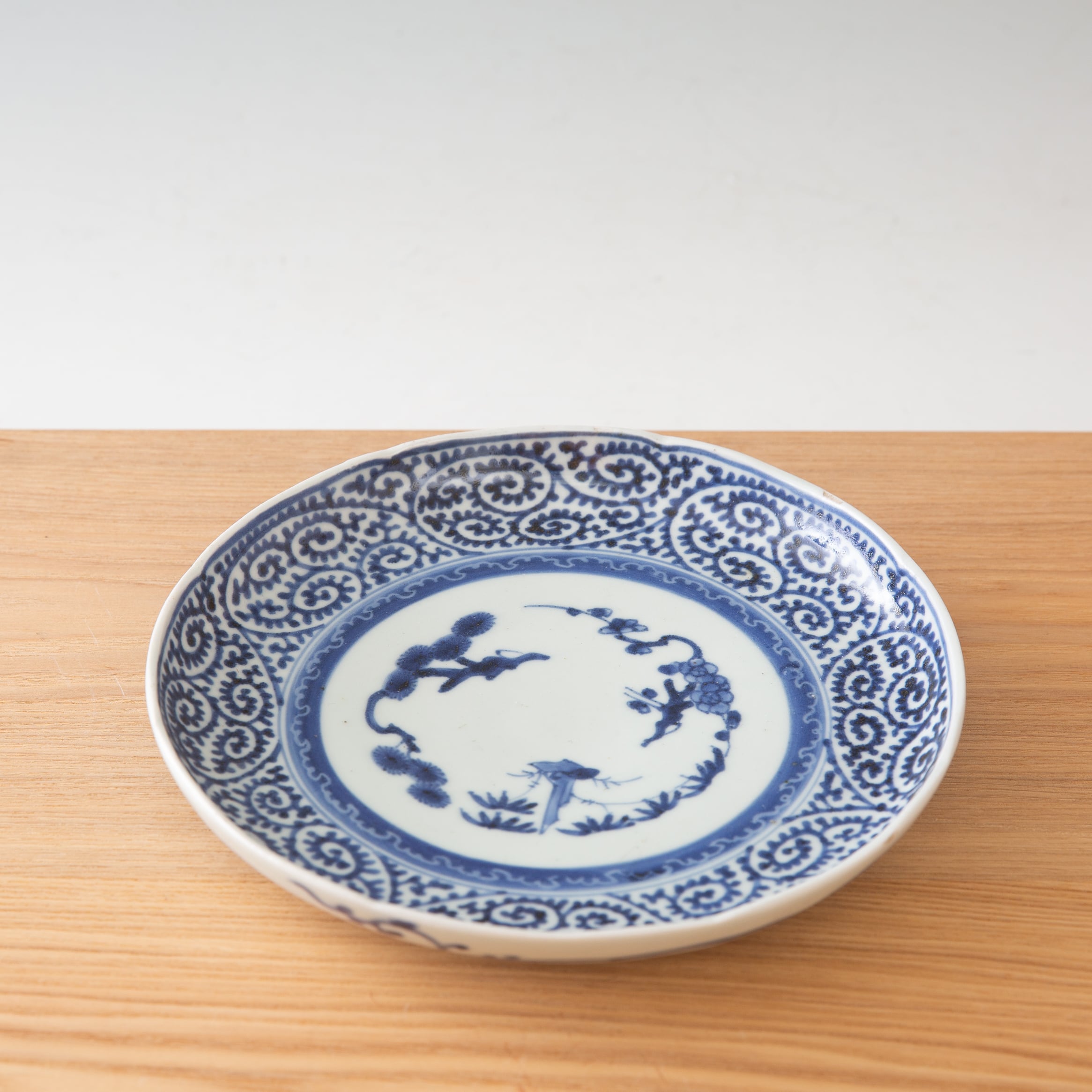 古伊万里 染付 蛸唐草 七寸皿 7寸 約20センチ プレート 平皿 大皿 見込み松竹梅 富貴長春銘 吉祥文様 江戸時代 江戸後期 唐草文様 日本古陶磁 暮らしの骨董 生活骨董 用の美 アンティーク コレクション 和骨董 伊万里 有田 和食器 懐石の器 お料理屋さんの器【BS38】