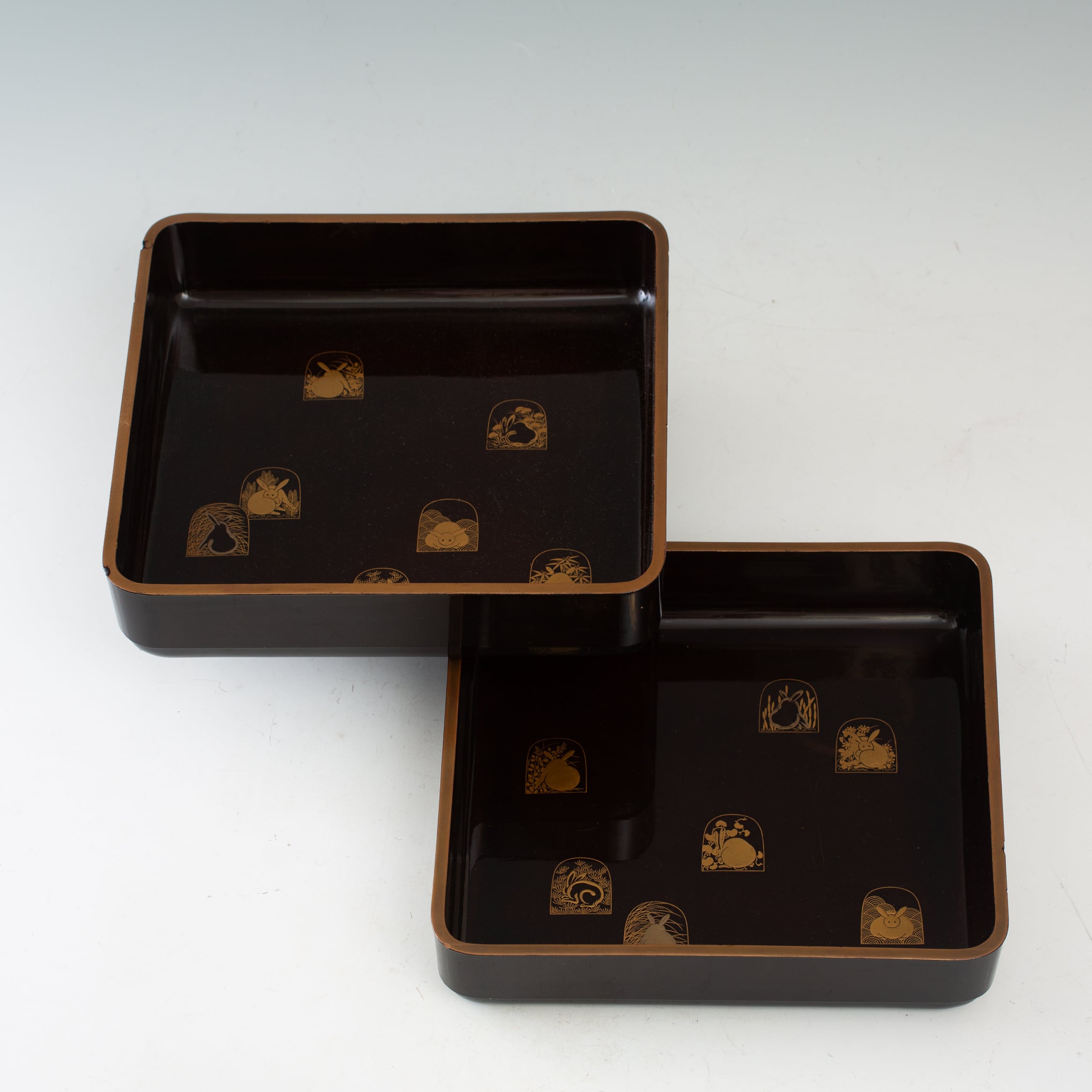 蒔絵 兎尽くし 盆 一対 ペア 2枚セット 揃い 桔梗 木賊 萩 芒 菊 青海波 吉祥文様 黒塗 角盆 廣蓋 四方盆 漆芸 木箱入 飾り盆 インテリア 漆器 うるし 日本の美 お盆 トレー トレイ【BB204】