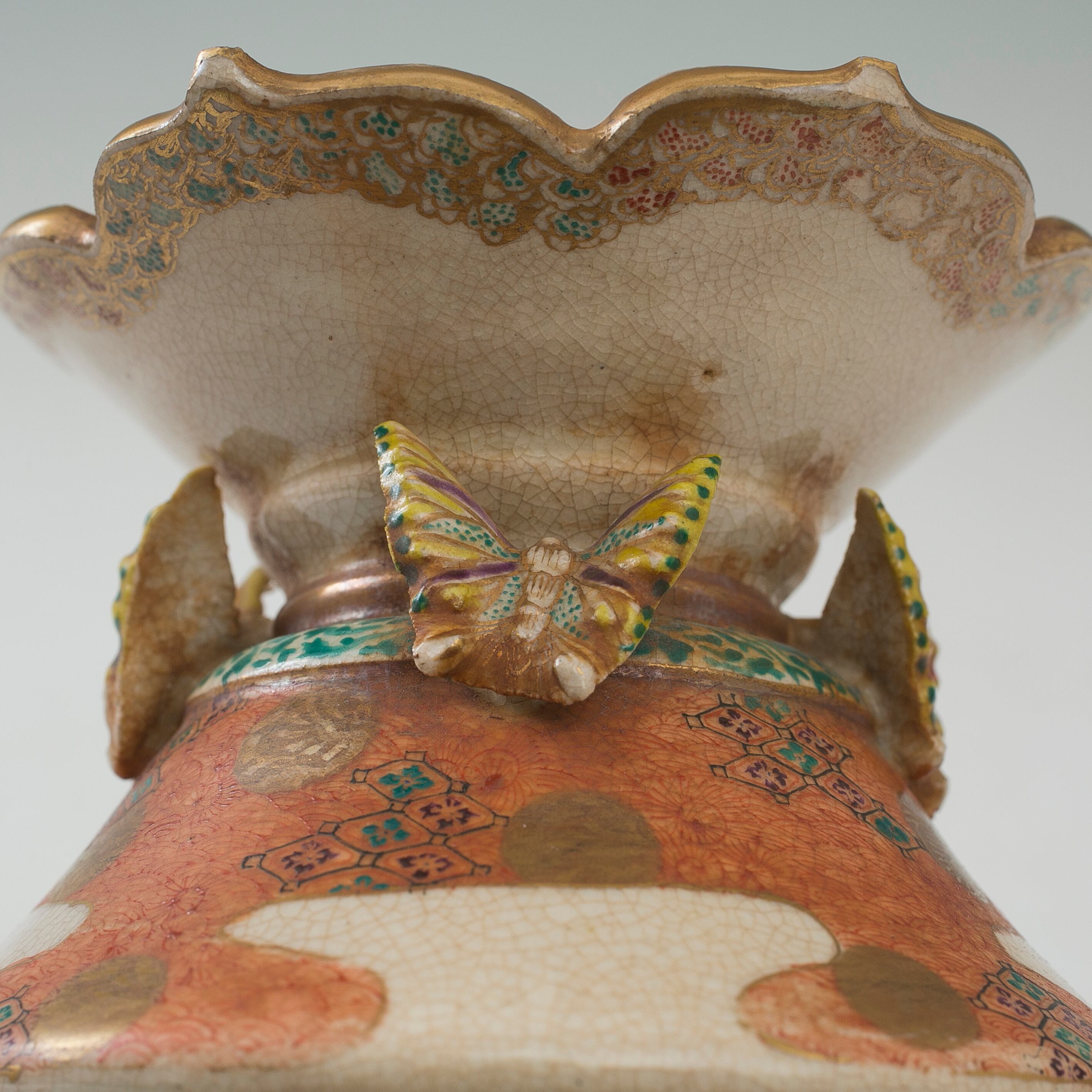 薩摩焼 蝶々 花瓶 亀甲文 青海波 金彩 錦手 色絵 小ぶり 絵付 フラワーベース 花器 置物 インテリア オブジェとして SATSUMA 明治美術 日本古陶磁 日本の美 アンティーク 骨董【BA13】
