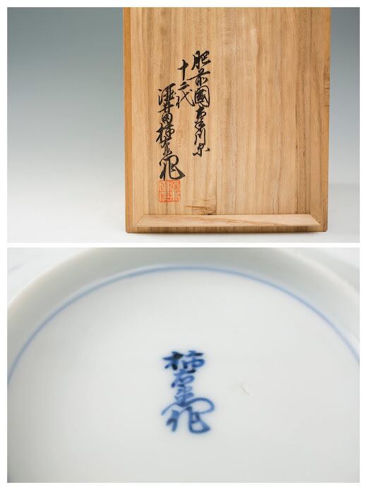 明治11(1878)年生れ、有田工業学校の前身である有田徒弟学校を卒業し、父11代について陶芸技術、とりわけ図案を学び、また南画も5年間習っている。大正6年に12代を襲名。昭和28(1953)年、初期の柿右衛門が創りだした濁手素地の技法の再現に後の13代とともに成功し、その技術は後年無形文化財として指定された。