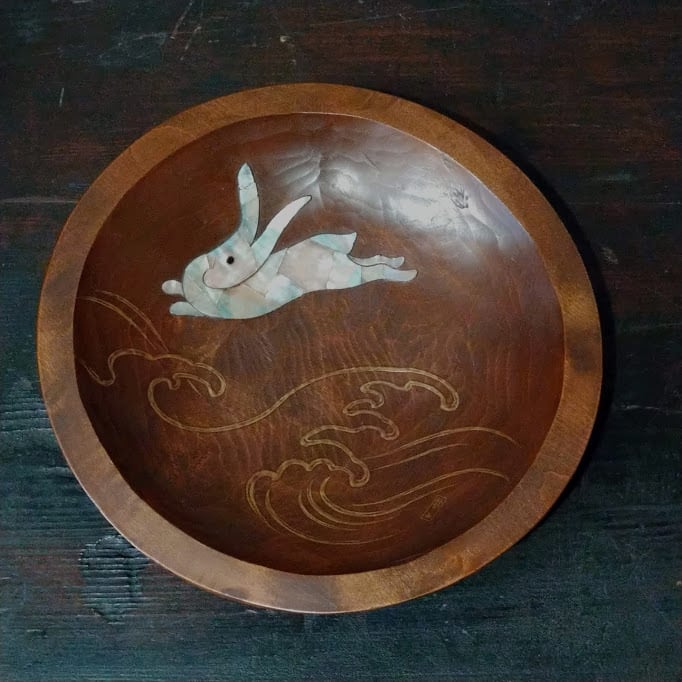 森川紫山 金蒔絵 螺鈿 波に兎 木鉢 菓子鉢 共箱 らでん うさぎ 茶道具 日本の古いもの アンティーク 飾り鉢【BE128】