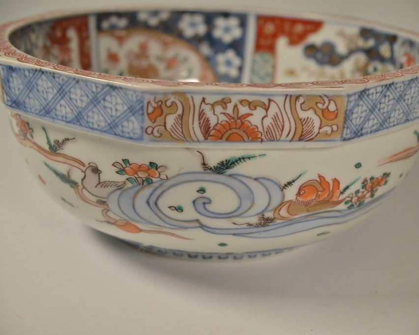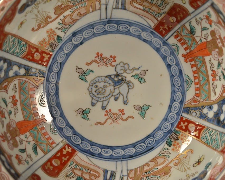 伊万里 松竹梅 鴛鴦 異邦人 見込み獅子 色絵金彩染付 二重高台 鉢 深鉢 かわいい獅子 古い伊万里 日本古陶磁 暮らしのなかの骨董 華やか 生活骨董 アンティーク 用の美【BE192】 | 3hige antique store | 京都・古門前の古美術店 | 三髭堂