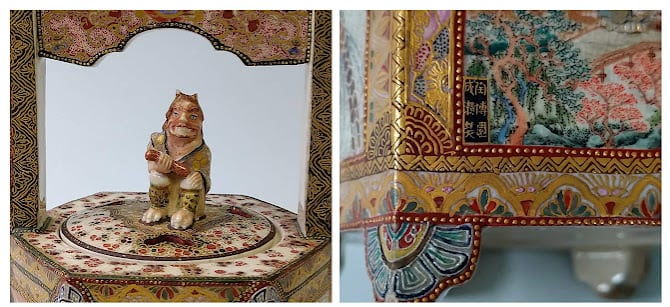 成瀬は全国各地で作られた薩摩焼風陶器のなかでも、細密画の元祖として知られ、明治期に発行された書画家番付にもその名が掲載されています。陶博園は成瀬が1886年(明治19年)に東京から地元岐阜県中津川に戻り始めた陶房の名前。ひねりものと呼ばれる置物を得意としたそうで、福禄寿がツマミになった香炉などが現存されています。