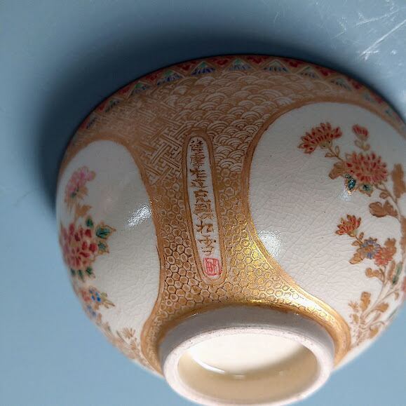 ◆薩摩左近充製松雪銘本田松雪絵付 菊花牡丹図煎茶碗