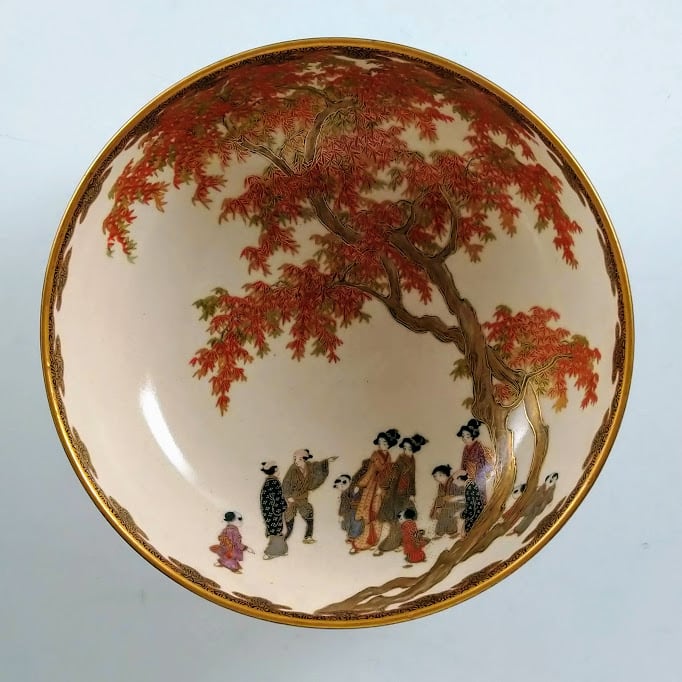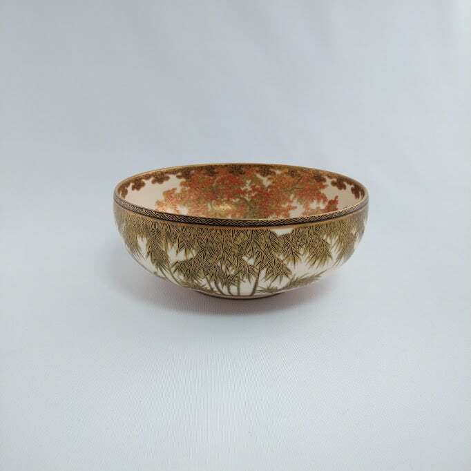 オールド薩摩 薩摩焼 金襴手 長州山 紅葉狩り 人物 紅葉 竹林 細密画 菓子器 鉢 碗 茶碗 茶道具 日本古陶磁 超絶技巧 骨董 アンティーク 日本の古いもの コレクターズアイテム 薩摩錦手 明治工芸 町衆 社会風俗 着物 皿 横浜 花瓶 花器 武者 武士 名所図会 大阪