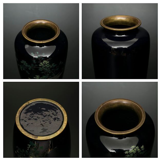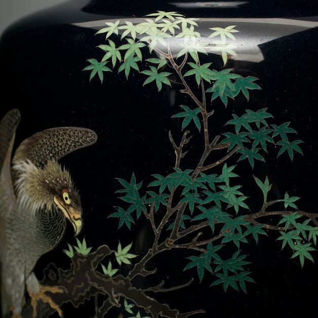 【状態】大変美しい七宝花瓶です。海外輸出用に作られたものかと思いますが、保管の過程で片方だけになってしまうことも多い中でペアで状態良く残されてきた貴重なひとしな。緑に生い茂る楓の木に、鷹が気高く留まっています。左右非対称の図案のバランスがよく、気品があります。