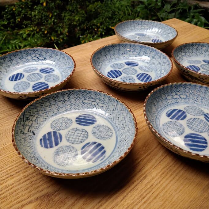 伊万里 染付 丸紋 紗綾形 縞 格子文 膾皿 なます皿 モダンデザイン アンティーク 日本の骨董 古陶磁 用の美 おしゃれな器 テーブルコーディネート かわいい骨董 生活骨董【BE403】 | 3hige antique store | 京都・古門前の古美術店 | 三髭堂