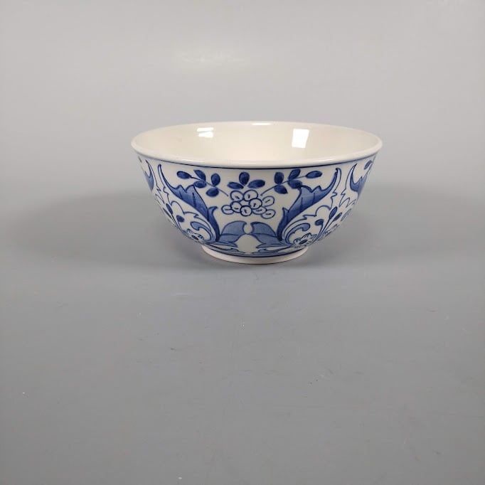 宇佐美屋は江戸時代に尾張藩御蔵元でしたが、明治以降、陶器の販売・製造、さらにはタイル製造と時代に合わせた製造を行いました。宇佐美屋による阿蘭陀写の焼き物の作成は明治期頃から。いかに舶来の「和蘭陀の青」に当時の人々の憧れがあったかが伝わってきます。こちらの菓子鉢も、優しい白に青の釉薬があざやかです。柔らかい土なので貫入はありますが、カケ
