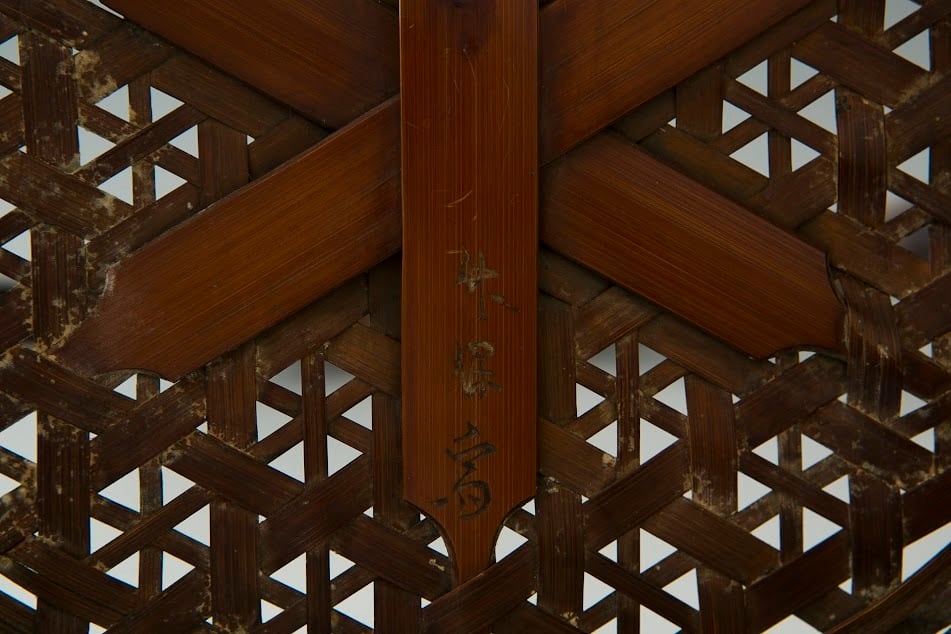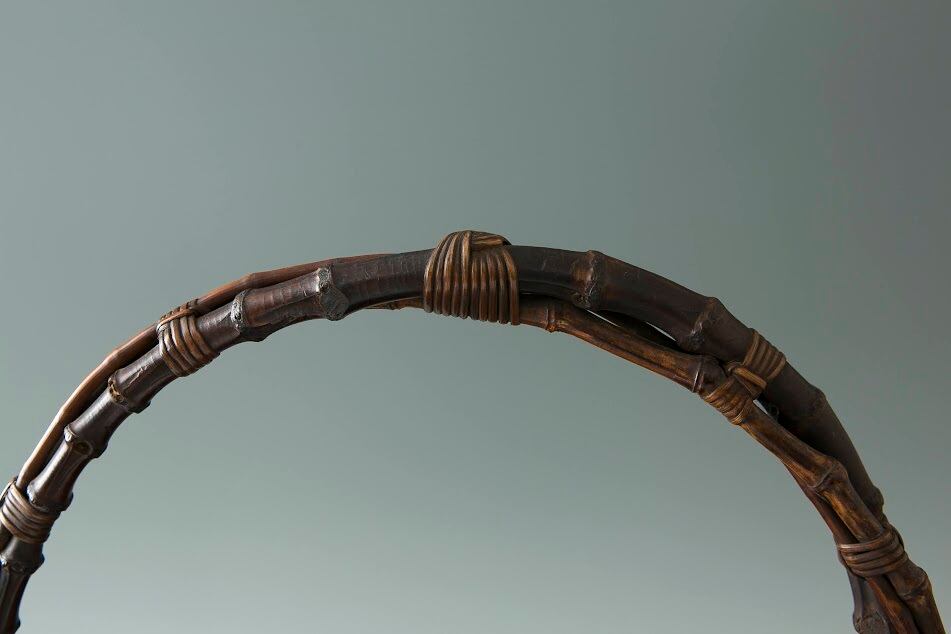 【状態】持ち手のバランスが美しい籠です。中央部分は六角形に編み込まれ、側面との差異もおもしろいです。底に「竹保斎」の銘。ところどころ竹が割れている箇所がございますが、全体としての状態はよく、味わい深い作品です。