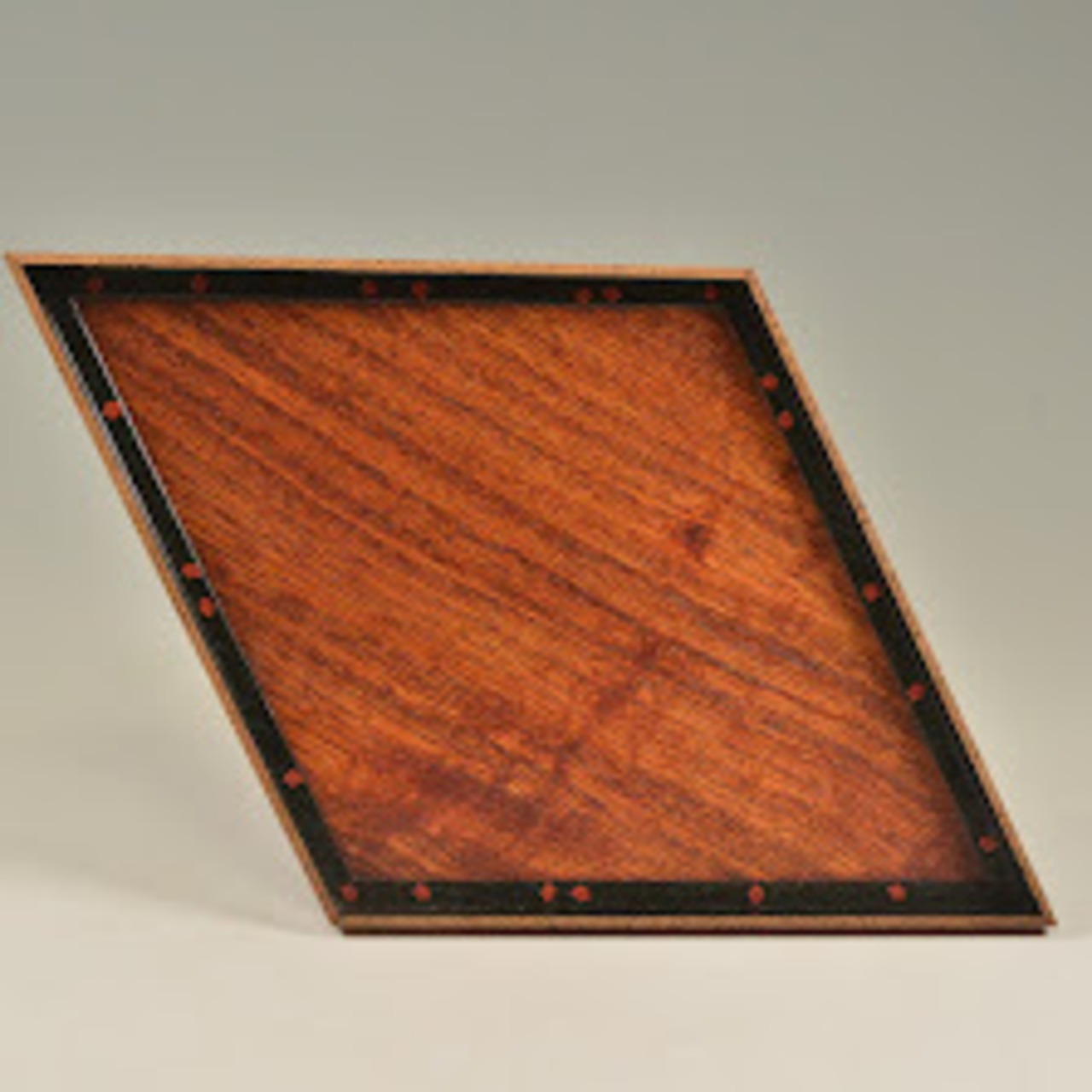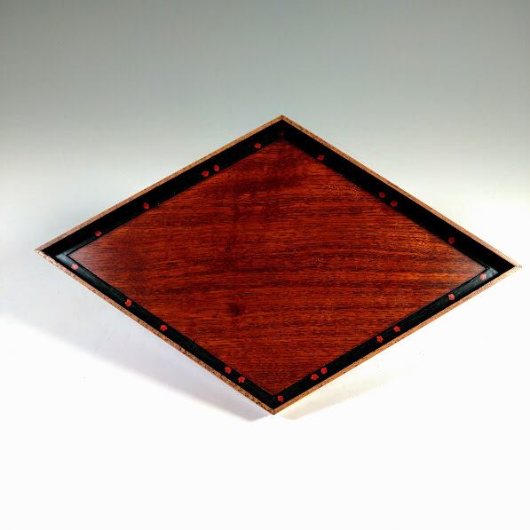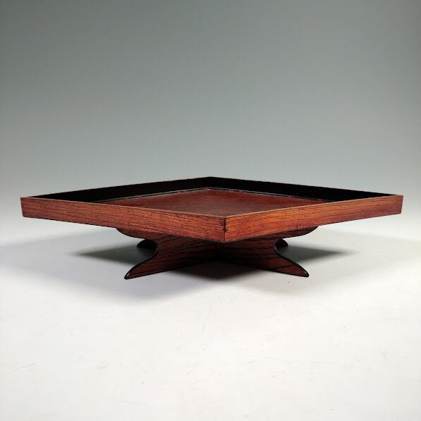 縁の部分が竹の模様、黒塗の部分に緑色で松葉、そして赤い梅が散らばり、全体で松竹梅のデザインになっています。菱餅をのせる菱台を思わせる形なのでお雛様の季節の室礼にもぴったり。上に小さなお雛様を置き玄関先などに飾っても可愛らしいと思います。経年によりほんの僅かなガタツキがあります(個人の感想としては許容範囲内かと思います)。