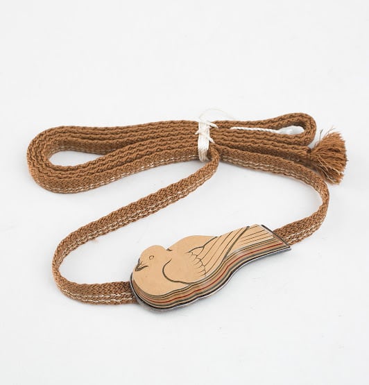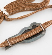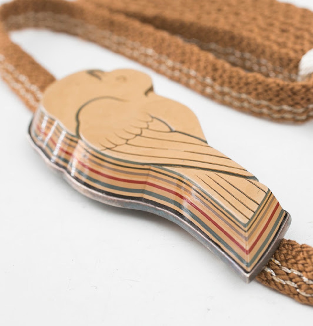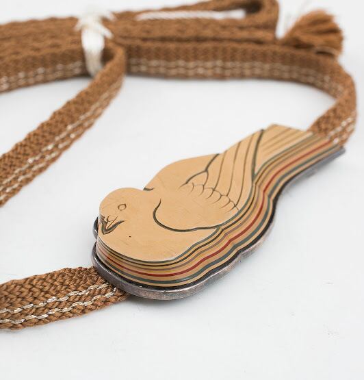 こちらは池内荷芳による帯留。ベージュ系の色漆を中心に赤や黒などの層をもちます。表面に少し使用感がありますが上品な仕上がり。