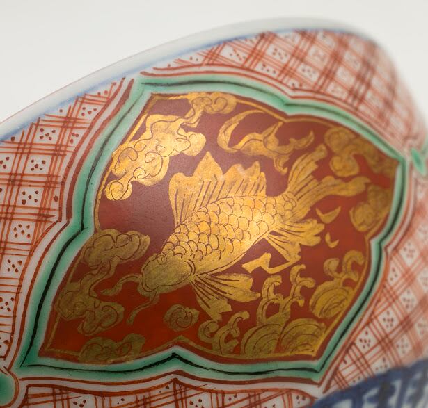 伊万里 色絵 金彩 魚紋 蓋茶碗 四方襷 格子 菱 窓絵 格狭間 錦手 かわいい骨董 普段使いにも 用の美 憧れの和骨董 和食器 飯茶碗【BA300】 | 3hige antique store | 京都・古門前の古美術店 | 三髭堂