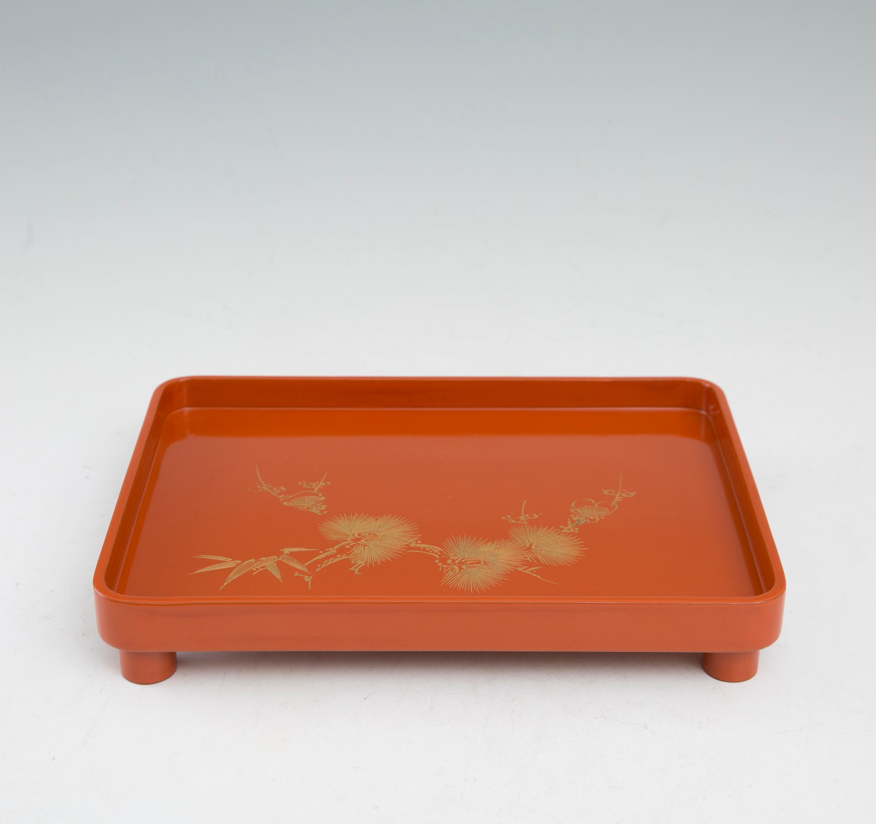 輪島塗 祝い膳 朱塗 洗朱 松竹梅 沈金 長方盆 足付小盆 高足 お正月の取り皿・プレートとして もてなしの和食器 アンティーク テーブルコーディネート 吉祥文様 【BB116】